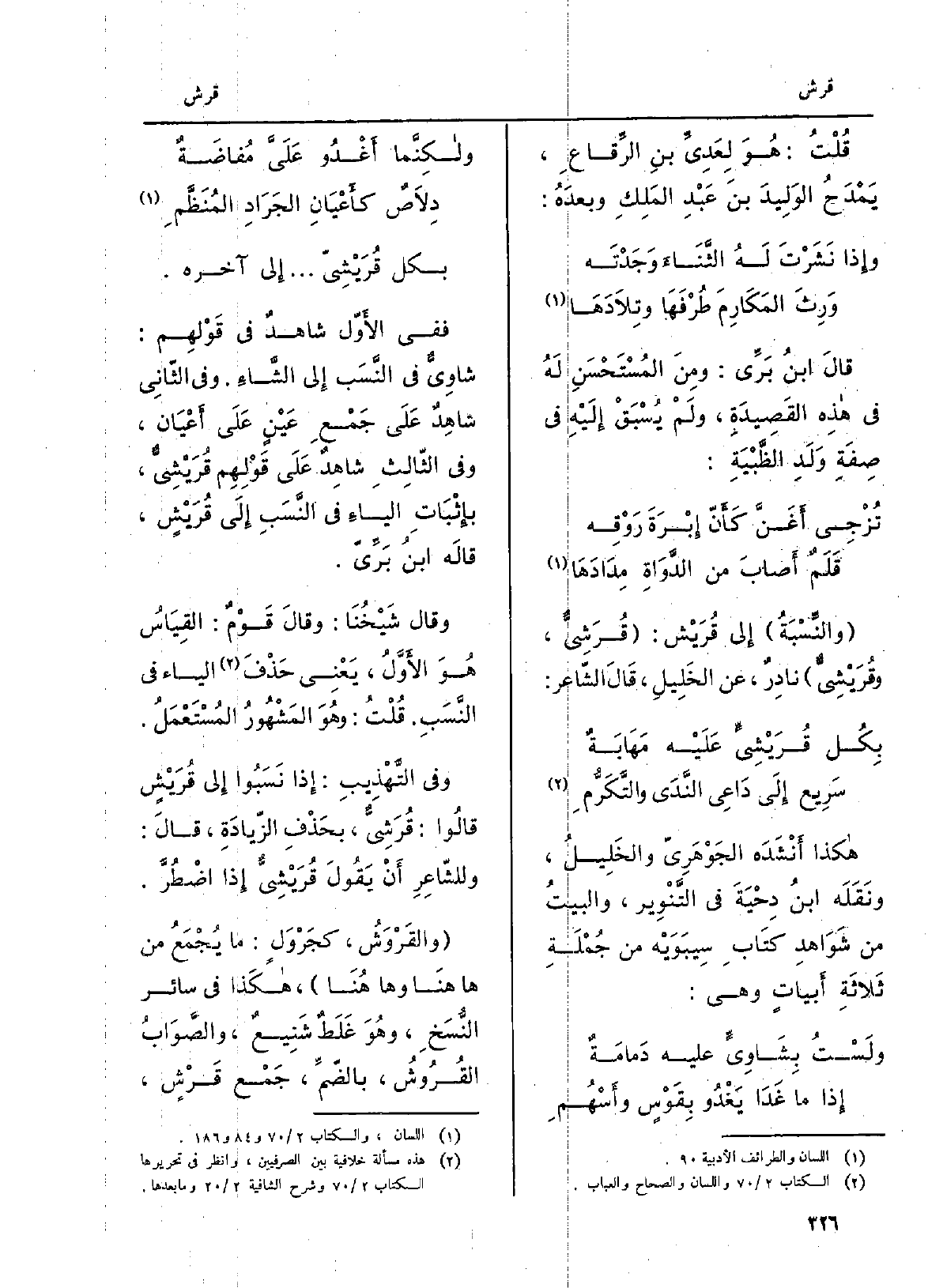 وَقَالَ شَيْخُنَا: وقالَ قَوْمٌ: القِيَاسُ هُوَ الأَوَّلُ، يَعْنِي حَذْفَ الياءِ فِي النَّسَبِ. قُلْتُ: وهُوَ المَشْهُورُ المُسْتَعْمَلُ. وَفِي التَّهْذِيبِ: إِذا نَسَبُوا إِلى قُرَيْشٍ قالُوا: قُرَشِيٌّ، بحَذْفِ الزّيادَةِ، قالَ: وللشّاعِرِ أَنْ يَقُولَ قُرَيْشِيٌّ إِذا اضْطَرَّ. والقَرْوَشُ، كجَرْوَلٍ: مَا يُجْمَعُ من هَا هنَا وَهَا هُنَا، هكذَا فِي سَائِر)
