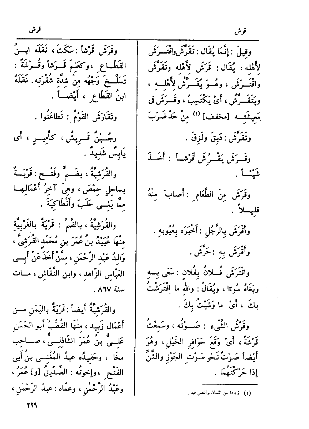 وأَقْرَش بِهِ: حَرَّشَ. واقْتَرَشَ فُلانٌ بِفُلانٍ: سَعَى بِهِ وبَغَاهُ سُوءاً، ويُقَالُ: واللهِ مَا اقْتَرَشْتُ بكَ، أَيْ مَا وَشَيْتُ بِكَ. وقَرْشُ الشَّيْءِ: صَوْتُه، وسَمِعْتُ قَرْشَةً، أَيْ وَقَعَ حَوَافِرِ الخَيْلِ، وهُوَ أَيْضاً صَوْتٌ نَحْوَ صَوْتِ الجَوْزِ والشَّنِّ إِذا حَرْكْتَهُمَا. وقَرَشَ قَرْشاً: سَكَتَ، نَقَلَه ابنُ القَطّاعِ، وكعَلِمَ قَرَشاً وقُرْشَه: تَسَلَّخَ وَجْهُه مِن شِدَّةِ شُقْرَتِه. نَقَلَهُ ابنُ القَطّاعِ، أَيْضاً. وتَقَارَشَ القَوْمُ: تَطاعَنُوا.