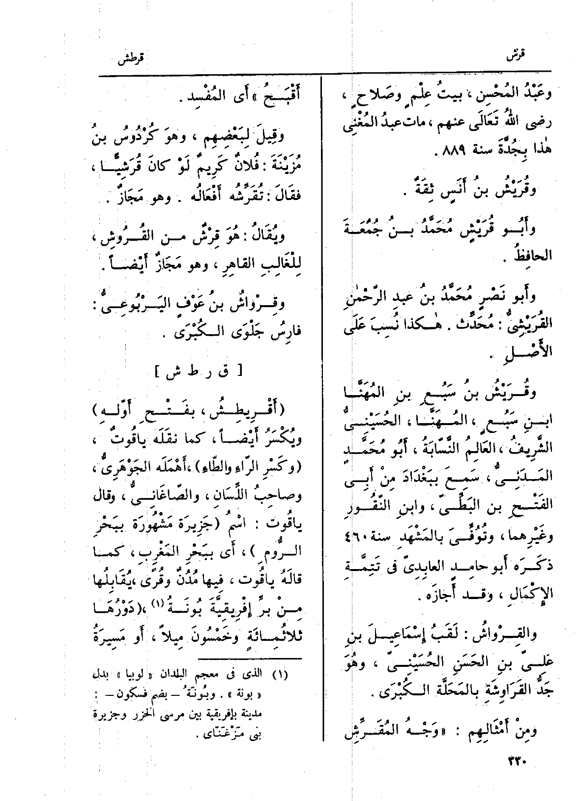 وعَبْدُ المُحْسِن، بيتُ عِلْمٍ وصَلاحٍ، رَضِي الله تَعَالَى عَنْهُم، مَاتَ عبدُ المُغْنِي هَذَا بِجُدَّةَ سنة. وقُرَيْشُ بنُ أَنَسٍ ثِقَةٌ. وأَبُو قُرَيْشٍ مُحَمَّدُ بنُ جُمُعَةَ الحافِظُ. وأَبو نَصْرٍ مُحَمَّدُ بنُ عبدِ الرّحْمنِ القُرَيْشِيُّ: مُحَدِّث. هَكَذَا نُسِبَ عَلَى الأَصْلِ. وقُرَيْشُ بنُ سَبُعِ بنِ المُهَنَّا ابنِ سَبُعٍ، المُهَنَّا، الحُسَيْنِيُّ الشَّرِيفُ، العَالِمُ النَّسّابَةُ، أَبُو مُحَمَّدٍ المَدَنِيُّ، سَمِعَ ببَغْدَادَ مِنْ أَبِي الفَتْحِ بن البَطِّيّ، وابنِ النّقُورِ وغَيْرِهما، وتُوُفِّي بالمَشْهَدِ سنة ذَكَرَه أَبو حامِدٍ العابِدِيّ فِي تَتِمَّةِ الإِكْمَالِ، وَقد أَجازَه. والقِرْواشُ: لَقَبُ إِسْمَاعِيلَ بنِ عَلِيّ بنِ الحَسَنِ الحُسَيْنِيّ، وهُوَ جَدُّ القَرَاوِشَةِ بالمَحَلَّة الكُبْرَى. ومِنْ أَمْثَالِهِم: وَجْهُ المُقَرِّش أَقْبَحُ أَي المُفْسِد. وقِيلَ لبَعْضِهِم، وهُوَ كُرْدُوسُ بنُ مُزَيْنَةَ: فُلانٌ كَرِيمٌ لَوْ كانَ قُرَشِيّاً، فقَالَ: تُقَرِّشُه أَفْعَالُه. وَهُوَ مَجَازٌ. ويُقَالُ: هُوَ قِرْشٌ من القُرُوشِ، لِلْغَالِبِ القاهِرِ، وَهُوَ مَجَازٌ أَيْضاً. وقِرْواشُ بنُ عَوْفٍ اليَرْبُوعِيُّ: فارِسُ جَلْوَى الكُبْرَى.
