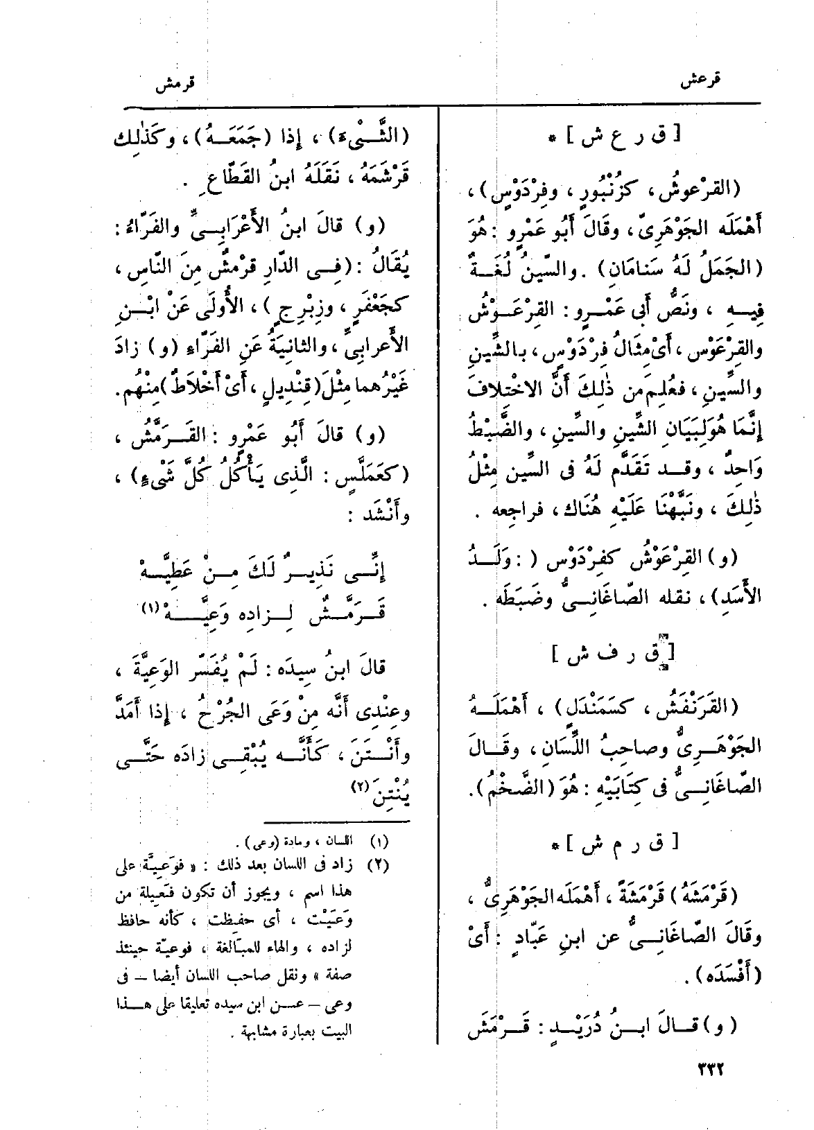 والسّينُ لُغَةٌ فِيهِ، ونَصُّ أَبِي عَمْروٍ: القِرْعَوْشُ والقِرْعَوْس، أَي مِثَالُ فِرْدَوْس، بالشِّينِ والسِّينِ، فعُلِمَ من ذلِكَ أَنَّ الاخْتلافَ إِنَّمَا هُو لِبَيَانِ الشِّينِ والسِّينِ، والضَّبْطُ وَاحِدٌ، وَقد تَقَدَّم لَهُ فِي السِّينِ مِثْلُ ذلكِ، َ ونَبَّهْنَا عَلَيْهِ هُنَاك، فراجِعه. والقِرْعَوْشُ كفِرْدَوْس: وَلَدُ الأَسَدِ، نَقله الصّاغَانِيُّ وضَبَطَه.