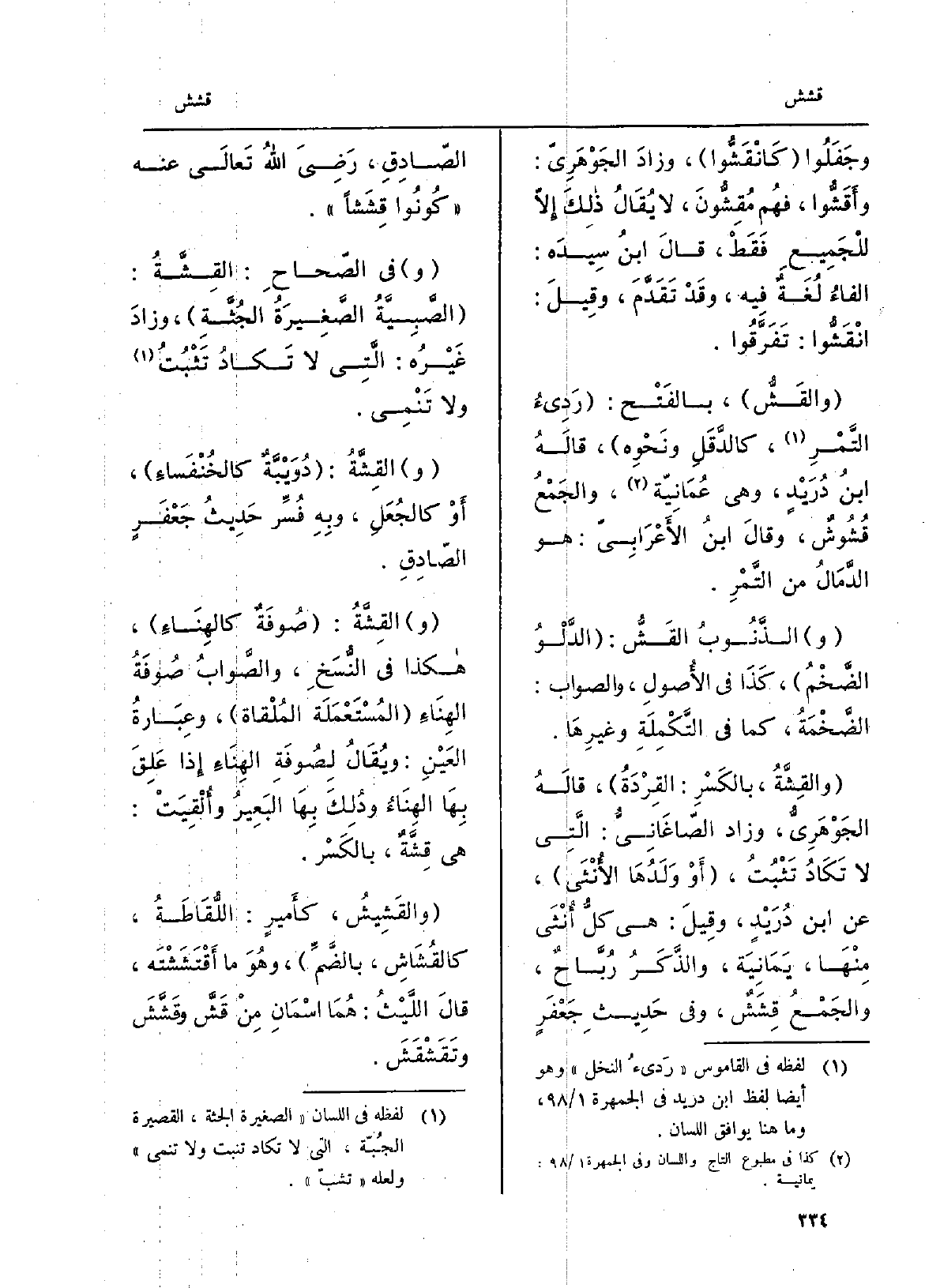 } والقِشَّةُ، بالكَسْرِ: القِرْدَةُ، قالَهُ الجَوْهَرِيُّ، وَزَاد الصّاغَانِيُّ: الَّتِي لَا تَكَادُ تَثْبُتُ، أَوْ وَلَدُهَا الأُنْثَى، عَن ابْن دُرَيْدٍ، وقِيلَ: هِيَ كلُّ أُنْثَى مِنْهَا، يَمَانِيَة، والذَّكَرُ رُبَّاحٌ، والجَمْعُ {قِشَشٌ، وَفِي حَدِيثِ جَعْفَرٍ الصّادِقِ، رَضِيَ اللهُ تَعالَى عَنهُ كُوْنُوا} قِشَشاً. وَفِي الصّحاحِ: {القِشَّةُ: الصَّبِيَّةُ الصَّغِيرَةُ الجُثَّةِ، وزادَ غَيْرُه: الَّتِي لَا تَكادُ تَثْبُتُ وَلَا تَنْمِي. والقِشَّةُ: دُوَيْبَّةٌ كالخُنْفَساءِ، أَوْ كالجُعَلِ، وبِهِ فُسِّر حَدِيثُ جَعْفَرٍ الصّادِقِ. والقِشَّةُ: صُوفَهٌ كالهِنَاءِ، هَكَذَا فِي النُّسَخِ، والصَّوابُ صُوفَةُ الهِنَاءِ المُسْتَعْمَلَة المُلْقاة، وعِبَارةُ العَيْنِ: ويُقَالُ لِصُوفَةِ الهِنَاءِ إِذا عَلِقَ بِهَا الهِنَاءُ ودُلِكَ بِهَا البَعِيرُ وأُلْقِيَتْ: هِيَ قِشَّةٌ، بالكَسْر.} والقَشِيشُ، كأَمِيرٍ: اللُّقَاطَةُ، {كالقُشَاشِ، بالضَّمِّ، وهُوَ مَا} اقْتَشَشْتَه، قالَ اللَّيْثُ: هُمَا اسْمَانِ مِنْ {قَشَّ} وقَشَّشَ! وتَقَشْقَشَ.