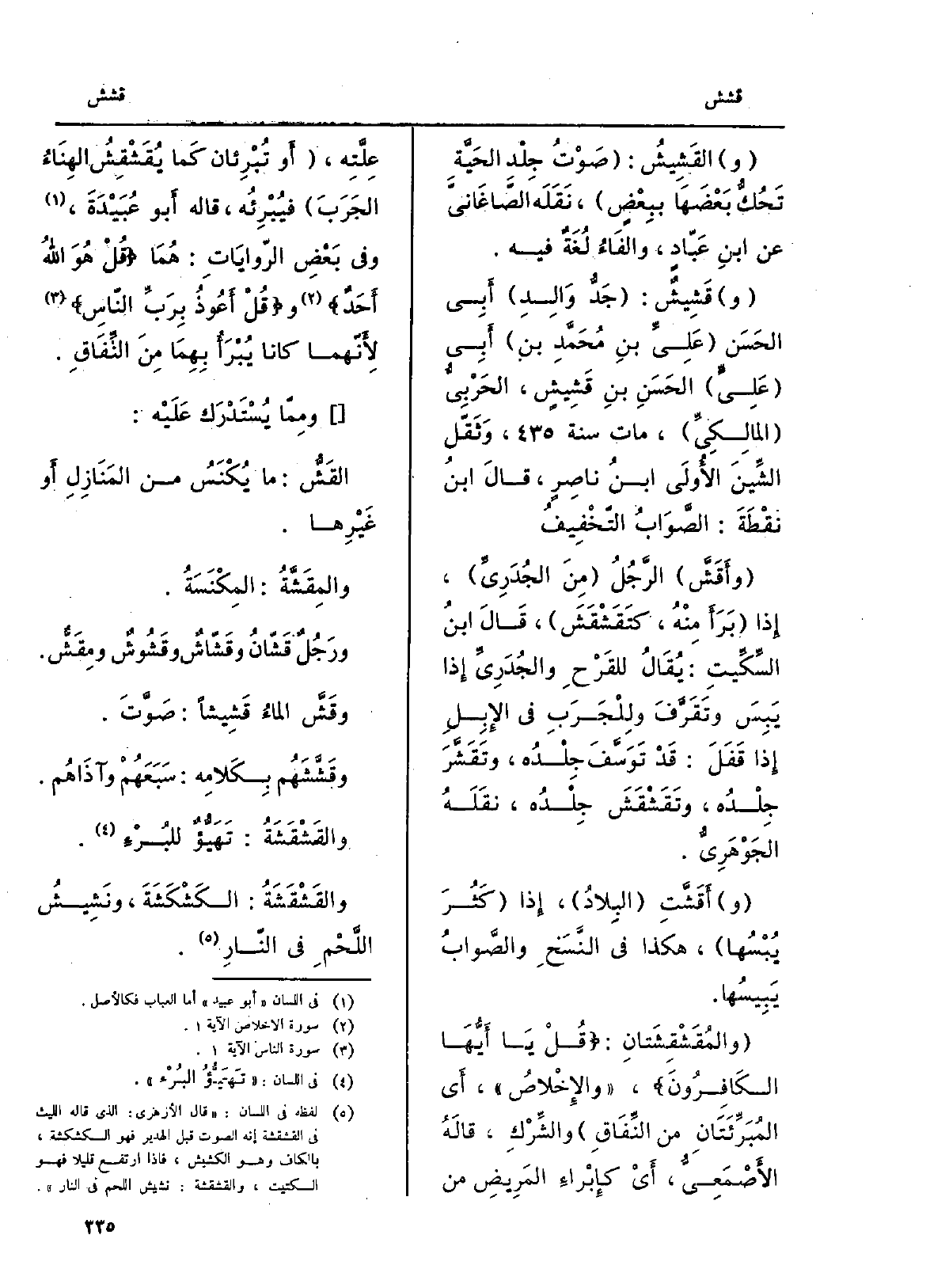 قالَ ابنُ نقْطَةَ: الصَّوَابُ التَّخْفِيفُ.} وأَقَشَّ الرَّجُلُ مِنَ الجُدَرِيِّ، إِذا بَرَأَ مِنْهُ، {كتَقَشْقَشَ، قَالَ ابنُ السِّكِّيتِ: يُقَالُ للقَرْحِ والجُدَرِيِّ إِذا يَبِسَ وتَقَرَّفَ وللِجْرَبِ فِي الإِبِلِ إِذا قَفَلَ: قَدْ تَوَسَّفَ جِلْدُه، وتَقَشَّرَ جِلْدُه،} وتَقَشْقَشَ جِلْدُه، نَقَلَه الجَوْهَرِيُّ. و {أَقَشَّتِ البِلادُ، إِذا كَثُرَ يُبْسُها، هَكَذَا فِي النَّسَخِ والصَّوابُ يَبِيسُها.} والمُقَشْقِشَتانِ: قُلْ يَا أَيُّهَا الكَافِرُونَ، والإِخْلاصُ، أَي المُبَرِّئَتَانِ من النِّفَاقِ والشِّرْكِ: قالَهُ الأَصْمَعِيُّ، أَيْ كإِبْراءِ المَرِيضِ من عِلَّتِه، أَو تُبْرِئان كَما {يُقَشْقِشُ الهِنَاءُ الجَرَبَ فيُبْرِئُه، قَالَه أَبو عُبَيْدَةَ، وَفِي بَعْضِ الرّوايَاتِ: هُمَا قُلْ هُوَ اللهُ أَحَدٌ وقُلْ أَعُوذُ بِرَبِّ النّاسِ لأَنّهما كَانَا يُبْرَأُ بِهِمَا مِنَ النِّفَاقِ. ومِمّا يُسْتَدْرَك عَلَيْه:} القَشُّ: مَا يُكْنَسُ من المَنَازِلِ أَو غَيْرِها.