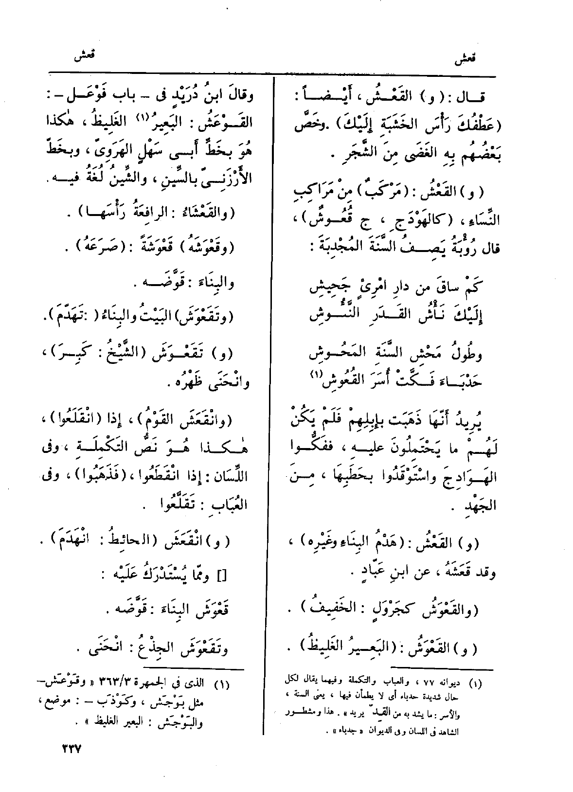 ِ قَالَ: والقَعْشُ، أَيْضاً: عَطْفُكَ رَْأَس الخَشَبَةِ إلَيْكَ. وخَصَّ بَعْضُهُم بِهِ الغَضَي مِنَ الشَّجَرِ. والقَعْشُ: مَرْكَبٌ مِنْ مَرَاكِبِ النِّسَاءِ، كالهَوْدَجِ، ج قُعُوشٌ، قَالَ رُؤْبَةُ يَصِفُ السَّنَةَ المُجْدِبَةَ: