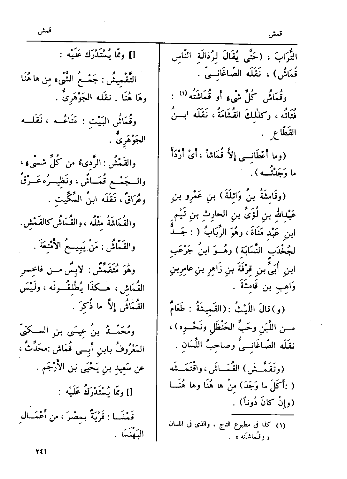 ِ التُّرَابَ، حَتَّى يُقَالَ لِرُذالَةِ النّاسِ قُمَاشٌ، نَقَلَه الصّاغَانِيّ. وقُمَاشُ كُلِّ شئٍ أَو قُمَاشَتُه: فُتَاتُه، وكذلِكَ القُشَامَةُ، نَقَلَه ابنُ القَطّاعِ. وَمَا أَعْطَانِي إِلاَّ قُمَاشاً، أَيْ أَرْدَأَ مَا وَجَدْتُه. وقَامِشَةُ بنُ وائِلَةَ بنِ عَمْروٍ بنِ عَبدِ اللهِ بنِ لُؤَيِّ بنِ الحارِثِ بنِ تَيْمِ ابنِ عَبْدِ مَنَاةَ، وهُوَ الرِّبَابُ: جَدٌّ لجُخْدَبٍ النَّسَابَةِ وهُوَ ابنُ جَرْعَبِ ابنِ أُبَيِّ بنِ قِرْفَةَ بنِ زَاهِرِ بنِ عامِرِ بنِ وَاهِبِ وبن قَامِشَةَ. وقالَ اللَّيْثُ: القَمِيشَةُ: طَعَامٌ من اللَّبَنِ وحَبِّ الحَنْظَلِ ونَحْوِه، نَقَلَه الصّاغَانِيُّ وصاحِبُ اللِّسَانِ. وتَقَمَّشَ القُمَاشَ، واقْتَمَشَه: أَكَلَ مَا وَجَدَ مِنْ هَا هُنَا وَهَا هُنَا وإِنْ كانَ دُوناً. وممّا يُسْتَدْرَك عَلَيْه: التَّقْمِيشُ: جَمْعُ الشَّيْءِ مِن هَا هُنَا وهَا هُنَا. نقَله الجَوْهَرِيُّ. وقُمَاشُ البَيْتِ: مَتَاعُه، نَقَله الجَوْهَرِيُّ. والقَمْشُ: الرَّدِئُ من كُلِّ شئٍ، والجَمْع قُمَاشٌ، ونَظِيرُه عَرْقٌ وعُرَاقٌ، نَقَلَه ابنُ السِّكِّيتِ. والقُمَاشَةُ مِثْلُه، والقُمَاشُ كالقَمْشِ. والقَمّاشُ: مَنْ يَبِيعُ الأَمْتِعَةَ. وهُوَ مُتَقَمِّشٌ: لابِسٌ من فاخِرِ القُمَاشِ، هكذَا يُطْلِقُونَه، ولَيْسَ القُمَاشُ إِلاَّ مَا ذُكِرَ.