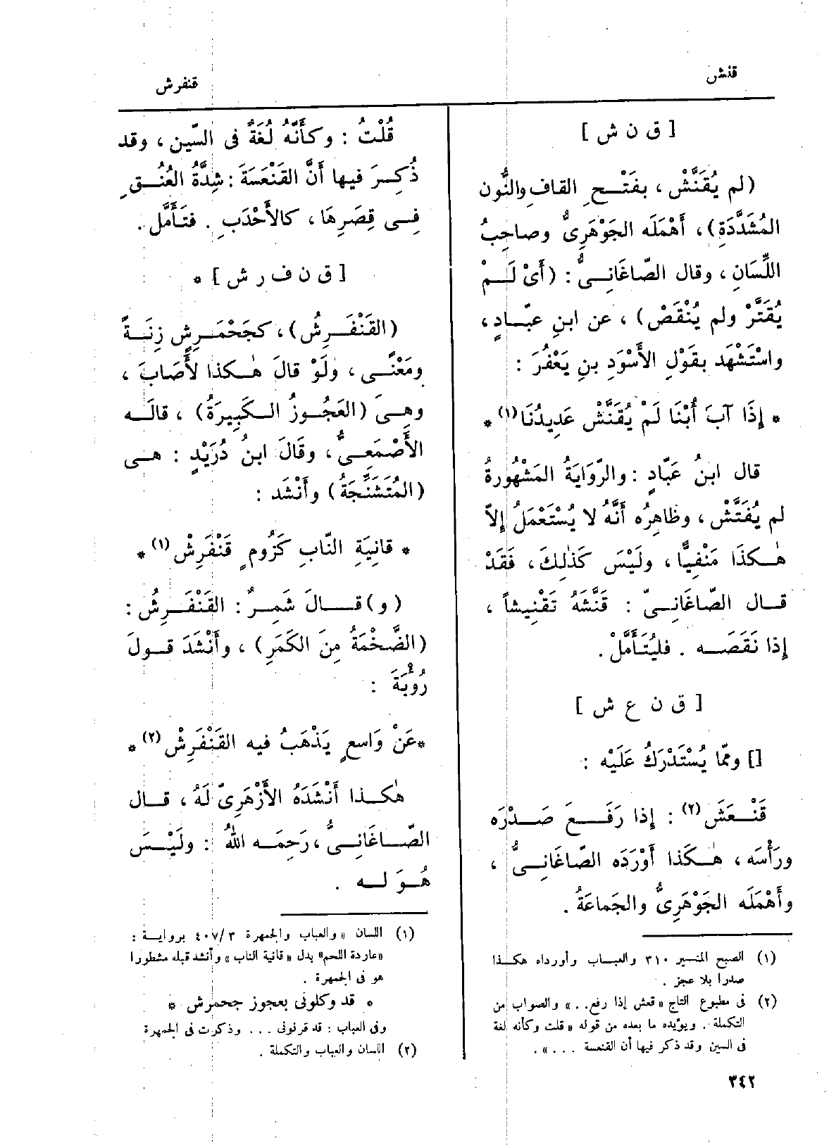 . لم يُقَنَّشْ، بفَتْحِ القافِ والنُّون المُشَدَّدَةِ، أَهْمَلَه الجَوْهَرِيُّ وصاحِبُ اللِّسَانِ، وَقَالَ الصّاغَانِيُّ: أَيْ لَمْ يُقَتَّرْ وَلم يُنْقَصْ، عَن ابنِ عبّادٍ، واسْتَشْهَد بقَوْلِ الأَسْوَدِ بنِ يَعْفُرَ: إِذَا آبَ أُبْنَا لَمْ يُقَنَّشْ عَدِيدُنَا.