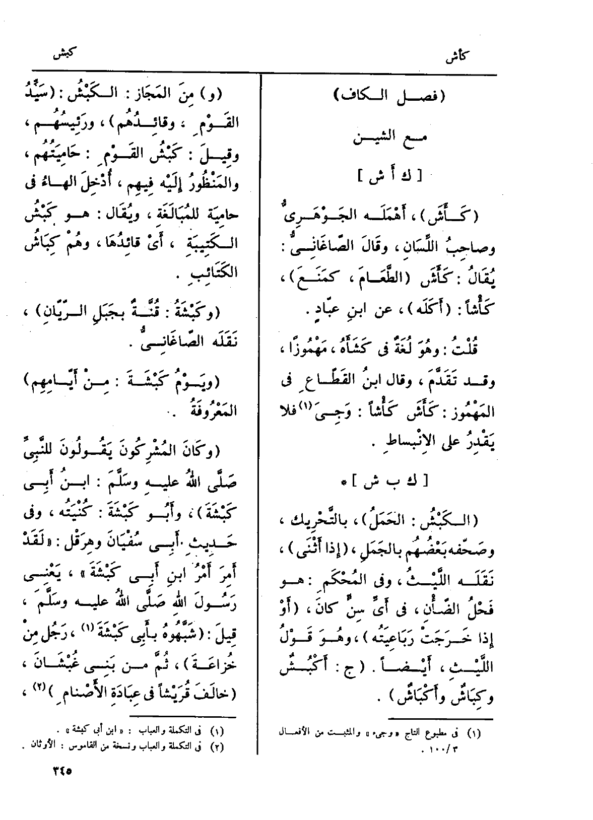 {كَأَشَ، أَهْمَلَه الجَوْهَرِيُّ وصاحِبُ اللِّسَانِ، وقَالَ الصّاغَانِيُّ: يُقَالُ:} كَأَشَ الطَّعَامَ، كمَنَعَ، {كَأْشاً: أَكَلَه، عَن ابنِ عبّادٍ. قُلْتُ: وهُوَ لُغَةٌ فِي كَشَأَهُ، مَهْمُوزاً، وَقد تَقَدَّمَ، وَقَالَ ابنُ القَطّاعِ فِي المَهْمُوز:} كَأَشَ! كَأْشاً: وَجِىَ فَلَا يَقْدِرُ على الاِنْبِساطِ.