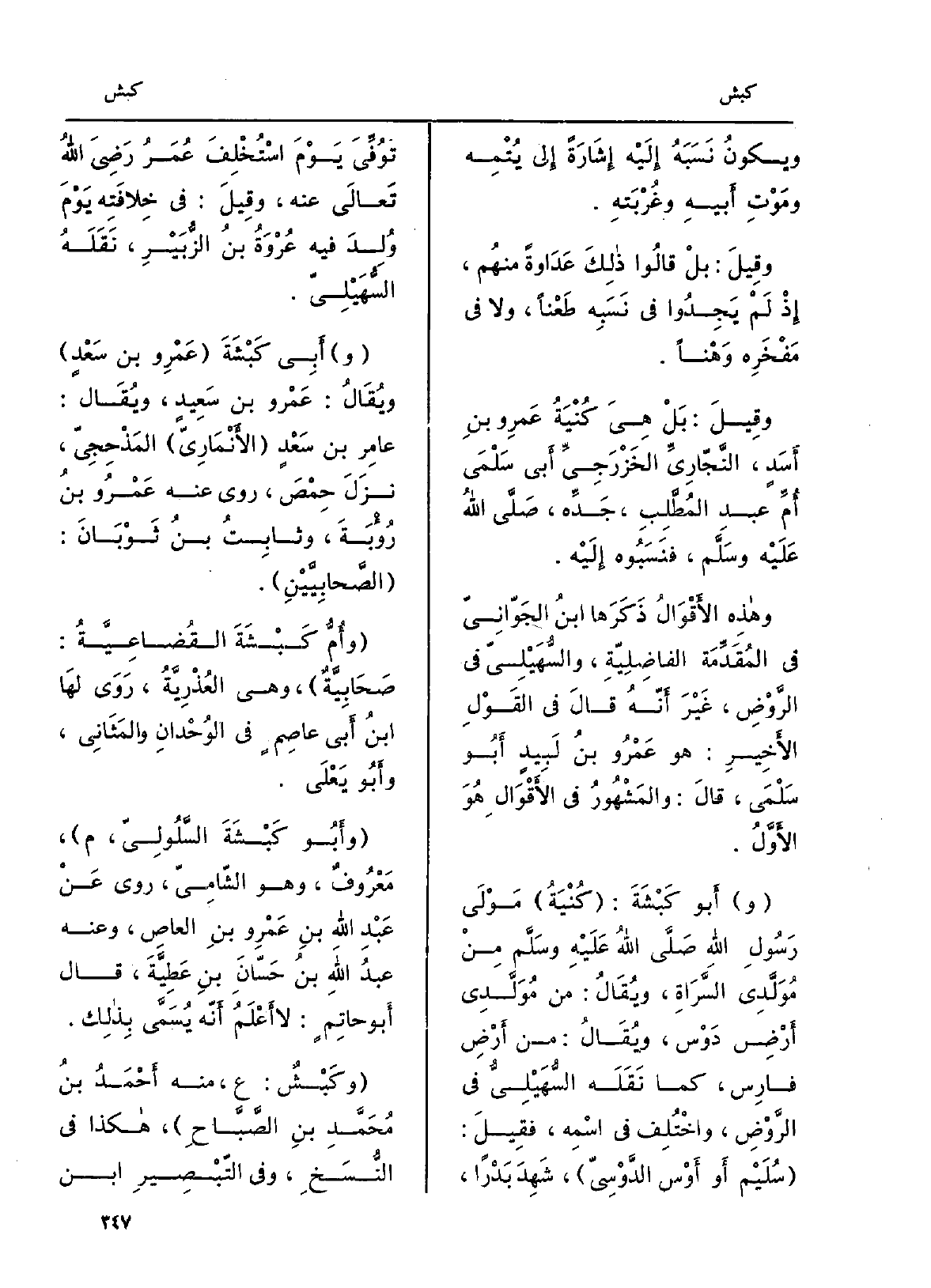 ويكونُ نَسَبَهُ إِلَيْه إِشَارَةً إِلى يُتْمِه ومَوْتِ أَبِيهِ وغُرْبَتِهِ. وقِيلَ: بلْ قالُوا ذلِكَ عَدَاوةً منهُم، إِذْ لَمْ يَجِدُوا فِي نَسَبِه طَعْناً، وَلَا فِي مَفْخَرِه وَهْناً. وقِيلَ: بَلْ هِيَ كُنْيَةُ عَمرِو بنِ أَسَدٍ، النَّجّارِيِّ الخَزْرَجِيِّ أَبي سَلْمَى أُمِّ عبدِ المُطَّلِبِ، جَدِّه، صَلَّى اللهُ عَلَيْه وسَلَّم، فنَسَبُوه إِلَيْه. وهذِه الأَقْوَالُ ذَكَرَها ابنُ الجَوّانِيّ فِي المُقَدِّمَة الفاضِلِيّةِ، والسُّهَيْلِيّ فِي الرَّوْض، غَيْرَ أَنّهُ قالَ فِي القَوْلِ الأَخِيرِ: هُوَ عَمْرُو بنُ لَبِيدٍ أَبُو سَلْمَى، قالَ: والمَشْهُورُ فِي الأَقْوَالِ هُوَ الأَوَّلُ. وأَبو كَبْشَةَ: كُنْيَةُ مَوْلَى رَسُولِ اللهِ صَلَّى اللهُ عَلَيْهِ وسَلَّم مِنْ مُوَلَّدِي السَّرَاةِ، ويُقَالُ: من مُوَلَّدِي أَرْضِ دَوْس، ويُقَالُ: من أَرْضِ فارِس، كَمَا نَقَلَه السُّهَيْلِيُّ فِي الرَّوْضِ، واخْتُلِفَ فِي اسْمِه، فقِيلَ: سُلَيْم أَو أَوْس الدَّوْسِيّ، شَهِدَ بَدْراً، توُفِّيَ يَوْمَ اسْتُخْلِفَ عُمَرُ رَضِيَ اللهُ تَعالَى عَنهُ، وقِيلَ: فِي خِلاَفَتِه يَوْمَ وُلِدَ فِيهِ عُرْوَةُ بنُ الزُّبَيْرِ، نَقَلَهُ السُّهَيْلِيّ. وأَبِي كَبْشَةَ عَمْرِو بن سَعْدٍ ويُقَالُ: عَمْرو بن سَعِيدٍ، ويُقَال: عامِر بن سَعْدٍ الأَنْمَارِيّ المَذْحِجِيّ، نَزَلَ حِمْصَ، روى عَنهُ عَمْرُو بنُ رُؤْبَةَ، وثابِتُ بنُ ثَوْبَانَ: الصَّحابِيَّيْنِ. وأُمُّ كَبْشَةَ القُضاعِيَّةُ: صَحَابِيَّةٌ، وَهِي العُذْرِيَّةُ، رَوَى لهَا ابنُ أَبي عاصِمٍ فِي الوُحْدانِ والمَثَانِي، وأَبُو يَعْلَى. وأَبُو كَبْشَةَ السَّلُولِيّ، م، مَعْرُوفٌ، وَهُوَ الشّامِيّ، رُوِيَ عَنْ عَبْدِ اللهِ بنِ عَمْرِو بنِ العاصِ، وَعنهُ عبدُ اللهِ بنُ حَسّانَ بنِ عَطِيَّةَ، قَالَ أَبو حاتِمٍ: لَا أَعْلَمُ أَنّه يُسَمَّى بِذلِك. وكَبْشٌ: ع، مِنْهُ أَحْمَدُ بنُ مُحَمَّدِ بنِ الصَّبَّاحِ، هَكَذَا فِي النُّسَخِ، وَفِي التّبصِيرِ ابْن