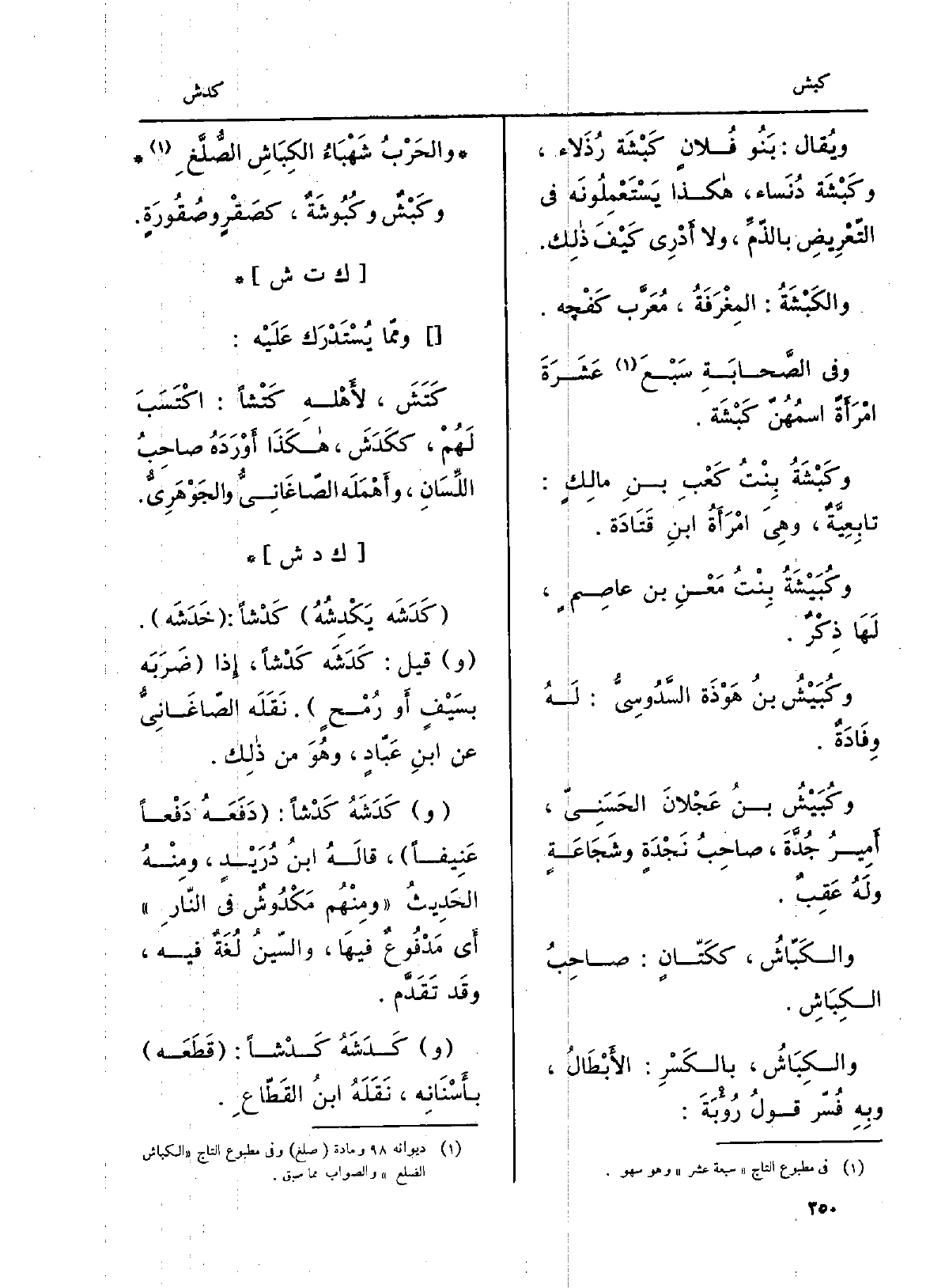 ويُقال بَنُو فُلانٍ كَبْشَة رُذَلاء، وكَبْشَة دُنْساء، هَكَذَا يَسْتَعْمِلُونَه فِي التَّعْرِيضِ بالذّمِّ، وَلَا أَدْرِي كَيْفَ ذلِك. والكَبْشَةُ: المِغْرَفَةُ، مُعَرَّب كَفْجه. وَفِي الصَّحابَةِ سَبْعَ عَشَرَةَ امْرَأَةً اسمُهُنّ كَبْشَة. وكَبْشَةُ بِنْتُ كَعْبِ بنِ مالِكٍ: تابِعِيَّةٌ، وهِيَ امْرَأةُ ابنِ قَتَادَة. وكُبَيْشَةُ بِنْتُ مَعءنِ بن عاصِمٍ، لَهَا ذِكْرٌ.