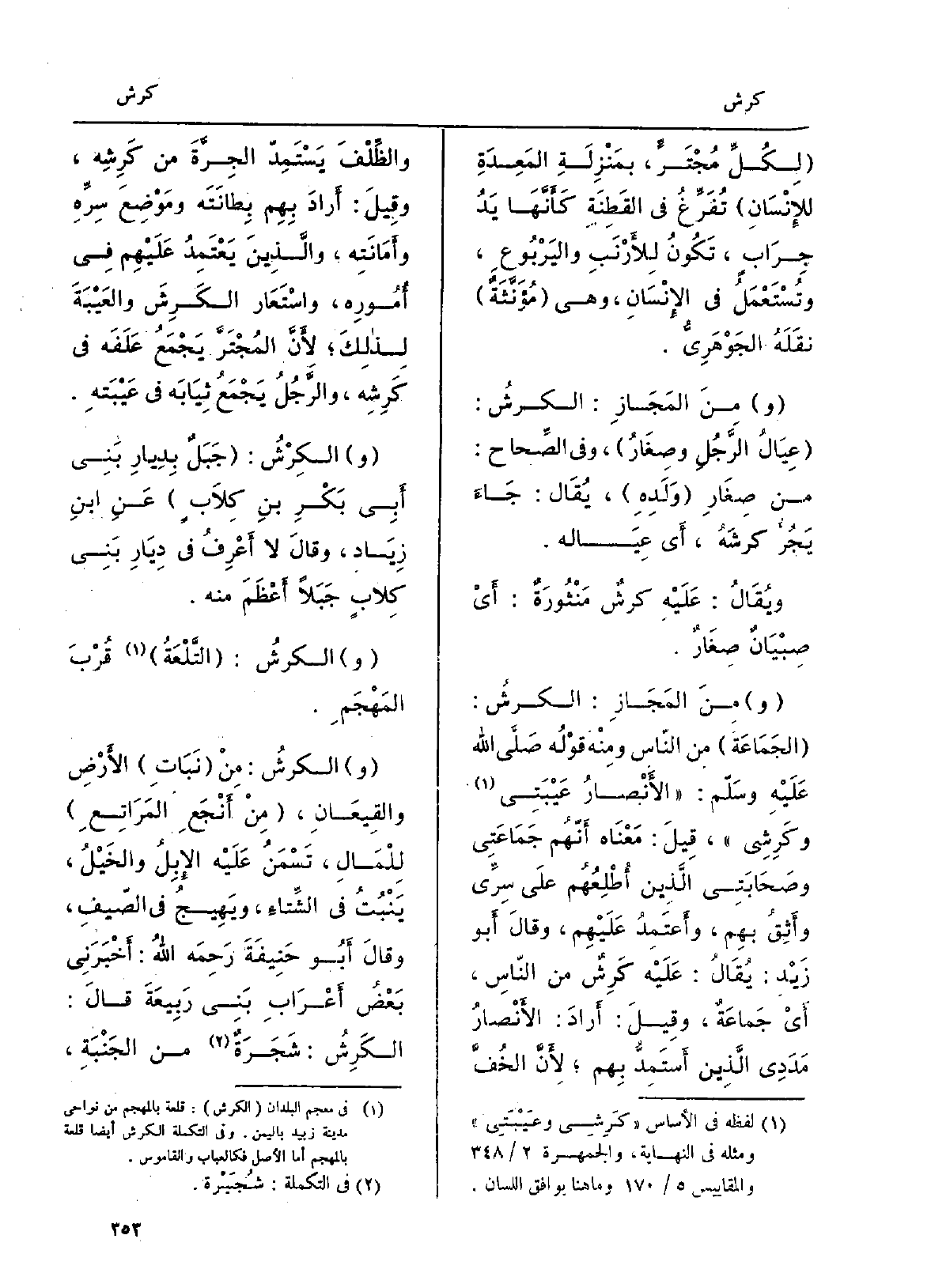 لِكُلِّ مُجْتَرٍّ، بمَنْزِلَةِ المَعِدَةِ للإِنْسَانِ تُفَرِّغُ فِي القَطِنَةِ كَأَنَّهَا يَدُ جِرَابٍ، تَكُونُ لِلأَرْنَبِ واليَرْبُوعِ، وتُسْتَعْمَلُ فِي الإِنْسَانِ، وَهي مُؤَنَّثَةٌ نَقَلَهُ الجَوْهَرِيُّ. ومِنَ المَجَازِ: الكرشُ: عِيَالُ الرَّجُلِ وصِغَارُ، وَفِي الصِّحاح: من صِغَارِ وَلَدِهِ، يُقَال: جَاءَ يَجُر كرشَهُ، أَي عِيَاله. ويُقَالُ: عَلَيْهِ كرشٌ مَنْثُورَةٌ: أَيْ صِبْيَانٌ صِغَارٌ. ومِنَ المَجَازِ: الكرشُ: الجَمَاعَة مِنَ النّاس ومِنْهُ قَوْلُه صَلَّى الله عَلَيْهِ وسَلّم: الأَنْصارُ عَيْبَتِي وكَرِشِي، قِيلَ: مَعْنَاهُ أَنَّهُم جَمَاعَتِي وصَحَابَتي الَّذِين أُطْلِعُهُم علَى سِرِّي وأَثِقُ بهِم، وأَعْتَمِدُ عَلَيْهِم، وقالَ أَبو زَيْدِ: يُقَالُ: عَلَيْه كَرِشٌ من النّاسِ، أَيْ جَمَاعَةٌ، وقِيلَ: أَرادَ: الأَنْصارُ مَدَدِي الَّذِين أَسْتَمِدُّ بِهم لأَنَّ الخُفَّ والظِّلْفَ يَسْتَمِدّ الجِرَّةَ من كَرِشِه، وقِيلَ: أَرادَ بِهِم بِطانَتَه ومَوْضِعَ سِرِّهِ وأَمَانَتِه، والَّذيِنَ يَعْتَمِدُ عَلَيْهِم فِي أُمُورِه، واسْتَعَار الكَرِشَ والعَيْبَةَ لِذلكَ لأَنَّ المُجْتَّر يَجْمَعُ عَلَفَه فِي كَرِشِه، والرَّجُلُ يَجْمَعُ ثِيَابَه فِي عَيْبَتهِ. والكِرْشُ: جَبَلٌ بدِيارِ بَنِي أَبي بَكْرِ بنِ كلاَبٍ عَن ابنِ زِيَاد، وقالَ لَا أَعْرِفُ فِي دِيَارِ بَنِي كِلابٍ جَبَلاً أَعْظَمَ مِنْهُ. والكرشُ: التَّلْعَةُ قُرْبَ المَهْجَمِ.