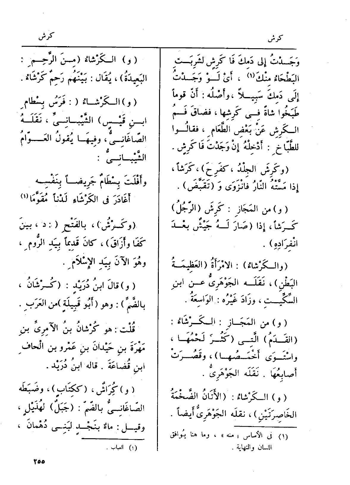 وكَرْشُ، بالفَتْحِ: د، بينَ كَفَا وأَزَاقَ، كانَ قَدِيماً بِيَدِ الرُّومِ، وهُوَ الآنَ بِيَدِ الإِسْلاَمِ. وقالَ ابنُ دُرَيْدٍ: كُرْشَانُ، بالضَّمِّ: وَهُوَ أَبو قَبِيلَةٍ من العَرَبِ. قُلْت: هُوَ كُرْشانُ بنُ الآمِرِيِّ بنِ مَهْرَةَ بنِ حَيْدانَ بنِ عَمْرو بن الْحافِ ابنِ قُضَاعَةَ. قَالَه ابنُ دُرَيْد. وكُرَاشٌ، ككِتَابٍ، وضَبَطَه الصّاغَانِيُّ بالضّمّ: جَبَلٌ لهُذَيْلٍ، وَقيل: ماءٌ بنَجْدٍ لبَنِي دُهْمانَ،