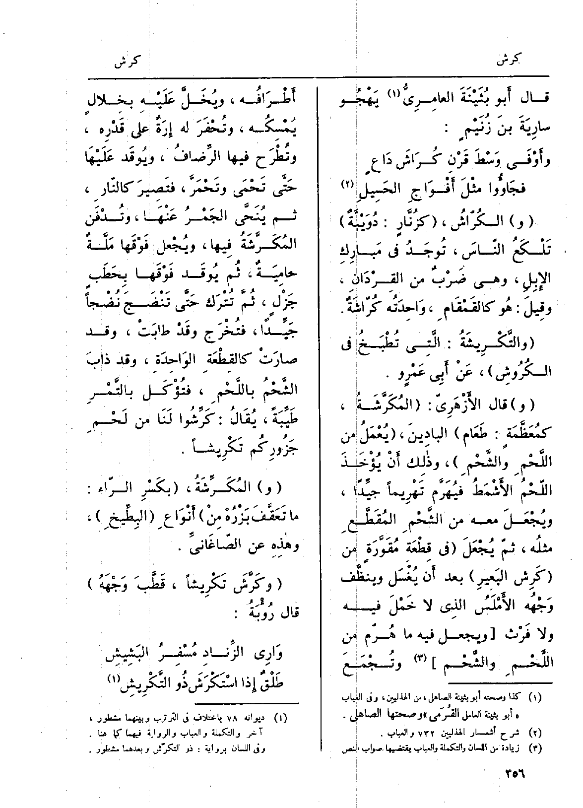 والكُرّاشُ، كزُنَّارٍ: دُوَيْبَّةٌ تَلْكَعُ النّاسَ، تُوْجَدُ فِي مَبارِكِ الإِبِلِ، وَهِي ضَرْبٌ من القِرْدَانِ، وقِيلَ:) هُو كالقَمْقَامِ، وَاحِدَتُه كُرّاشَةٌ. والتَّكْرِيشَةُ: الَّتِي تُطْبَخُ فِي الكُرُوشِ، عَنْ أَبِي عَمْروٍ. وَقَالَ الأََزْهَرِيّ: المُكَرَّشَةُ، كمُعَظَّمَةٍ: طَعَام البادِينَ، يُعْمَلُ من اللَّحْمِ والشَّحْمِ، وذلِكَ أَنْ يُؤْخَذَ اللّحْمُ الأَشْمَطُ فيُهَرَّم تَهْرِيماً جيِّداً، ويُجْعَلَ مَعَه من الشَّحْمِ المُقَطَّعِ مثلُه، ثمّ يُجْعَلَ فِي قِطْعَة مُقَوَّرَةٍ من كَرِش البَعيرِ بعد أَن يُغْسَل وينظَّف وَجْهُه الأَمْلَسُ الذِي لَا خَمْلَ فِيهِ وَلَا فَرْث وَيجْعَل فِيهِ مَا هُرّم من اللَّحْمِ والشَّحْم وتُجْمَعَ أَطرَافُه، ويُخَلَّ عَلَيْهِ بخِلالٍ يُمْسِكُه، وتُحْفَرَ لَهُ إِرَةٌ على قَدْرِه، وتُطْرَح فِيهَا الرِّضافُ، ويُوقَد عَلَيْهَا حَتَّى تَحْمَى وتَحْمَرَّ، فتَصِيرَ كالنّارِ، ثمَّ يُنَحَّي الجَمْرُ عَنْهَا، وتُدْفَن المُكَرَّشَةُ فِيهَا، ويُجْعل فَوْقَها مَلَّةٌ حامِيَةٌ، ثُم يُوقَد فَوْقَها بِحَطَبٍ جَزْلٍ، ثُمَّ تُتْرَك حَتَّى تَنْضَجَ نُضْجاً جَيِّداً، فتُخْرَج وقَدْ طابَتْ، وَقد صارَتْ كالقِطْعَةِ الوَاحِدَةِ، وَقد ذابَ الشَّحْمُ باللَّحْمِ، فتُؤْكَل بالتَّمْرِ طَيِّبَةً، يُقَالُ: كَرَّشُوا لَنَا من لَحْمِ جَزُورِكُم تَكْرِيشاً. والمُكَرِّشَةُ، بكَسْرِ الرّاء: مَا تَعَقَّفَ بَزْرُةْ مِنْ أَنْوَاعِ البِطِّيخِ، وهذِهِ عَن الصّاغَانِيِّ. وكَرَّشَ تَكْرِيشاً، قَطَّبَ وَجْهَهُ قَالَ رُؤْبَةُ:
