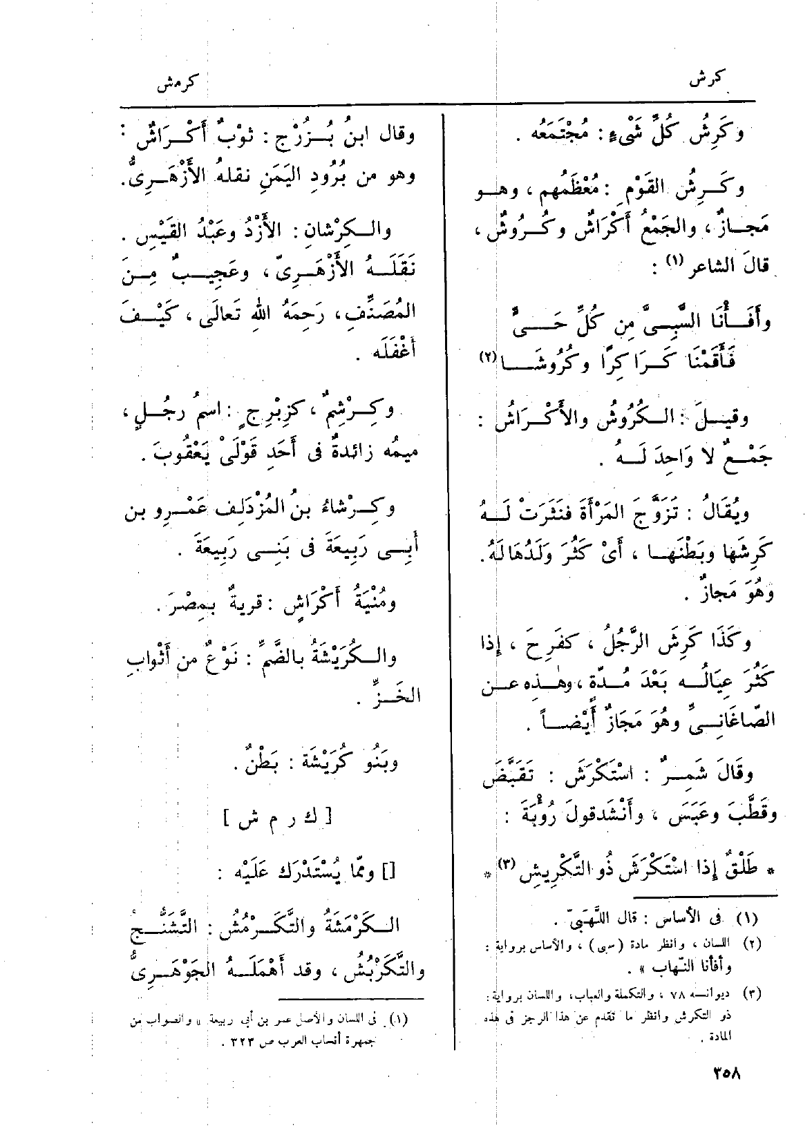 وقيلَ: الكُرُوشُ والأَكْرَاشُ: جَمْعٌ لَا وَاحِدَ لَهُ. ويُقَالُ: تَزَوَّجَ المَرْأَةَ فنَثَرَتْ لَهُ كَرِشَها وبَطْنَها، أَيْ كَثُرَ وَلَدُهَا لَهُ. وهُوَ مَجازٌ. وكَذَا كَرِشَ الرَّجُلُ، كفَرِحَ، إِذا كَثُرَ عِيَالُه بَعْدَ مُدّةٍ، وهذِه عَن الصّاغَانِيِّ وهُوَ مَجَازٌ أَيْضاً. وقَالَ شَمِرٌ: اسْتَكْرَشَ: تَقَبَّضَ وقَطَّبَ وعَبَسَ، وأَنْشَد قولَ رُؤْبَةَ: طَلْق إِذا اسْتَكْرَشَ ذُو التَّكْرِيشِ وَقَالَ ابنُ بُزُرْج: ثوبٌ أَكْرَاشٌ: وَهُوَ من بُرُودِ اليَمَنِ نقلهُ الأَزْهَرِيُّ. والكِرْشانِ: الأَزْدُ وعَبْدُ القَيْسِ. نَقَلَهُ الأَزْهَرِيّ، وعَجِيبٌ مِنَ المُصَنِّفِ، رَحِمَهُ اللهِ تَعالَى، كَيْفَ أَغْفَلَه. وكِرْشِمٌ، كزِبْرِجٍ: اسمُ رجُلٍ، ميمُه زائدةٌ فِي أَحَدِ قَوْلَيْ يَعْقُوبَ. وكِرْشاءُ بنُ المُزْدَلِف عَمْرِو بن أَبِي رَبِيعَةَ فِي بَنِي رَبِيعَةَ. ومُنْيَةُ أَكْرَاشٍ: قريةٌ بمِصْرَ. والكُرَيْشَةُ بالضَّمِّ: نَوْعٌ من أَثْوابِ الخَزِّ. وبَنُو كُرَيْشَة: بَطْنٌ.