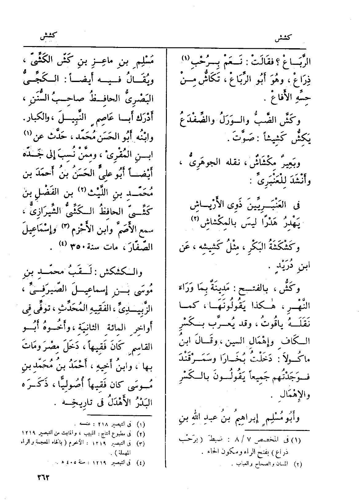 {وكَشْكَشَةُ البَكْرِ، مثْلُ} كَشِيشِه، عَن ابنِ دُرَيْدٍ. {وكَشُّ، بِالْفَتْح: مَدِينَةٌ بِمَا وَرَاءَ النَّهْرِ، هَكَذَا يَقُولُونَهَا، كَمَا نَقَلَهُ ياقُوتُ، وَقد يُعرَّب بكَسْرِ الكَافِ وإِهْمَالِ السِّين، وقَالَ ابنُ ماكُولاَ: دَخَلْتُ بُخَارَا وسَمَرْقَنْدَ فوَجَدْتُهم جَمِيعاً يَقُولُونَ بالكَسْرِ والإِهْمَالِ. وأَبُو مُسْلِمٍ إِبراهِيمُ بنُ عبدِ اللهِ بنِ مُسْلِمِ بنِ ماعِزٍ بنِ} كَشّ {- الكَشِّيّ، ويُقَالُ فِيهِ أَيضاً: الكَجِّيُّ البَصْرِيُّ الحافِظُ صاحِبُ السُّنَنِ، أَدْرَك أَبا عَاصِمٍ النَّبِيلَ، والكبار. وابْنُه أَبُو الحَسَن مُحَمّد، حَدَّث عَن ابنِ المُقْرِئ، ومِمَّنْ نُسِبَ إِلى جَدّه أَيْضاً أَبُو علِيٍّ الحَسَنُ بنُ أَحمَدَ بنُ مُحَمّدِ بنِ اللَّيْث بن الفَضْلِ بن كَشِّيّ الحافِظُ الكَشِّيُّ الشِّيرَازِيُّ، سمع الأَصَمَّ وَابْن الأَحْزم وإِسْمَاعِيلَ الصّفّارَ، مَاتَ سنة 350.} والكشكش: لَقَبُ محمّدِ بنِ مُوسَى بنِ إِسماعِيلَ الصّيرَفِيِّ، الزَّبِيديِّ، الفَقِيهِ المُحَدِّثِ، توفِّي فِي أَواخِرِ الْمِائَة الثانِيَةِ، وأَخُوهُ أَبُو القاسِمِ كَانَ فَقِيهاً، دَخَلَ مِصْرَ ومَاتَ بهَا، وابنُ أَخِيهِ، أَحْمَدُ بنُ مُحَمّدِ بنِ مُوسَى كَانَ فَقِيهاً أُصُولِيّاً، ذَكَرَه البَدْرُ الأَهْدَلُ فِي تاِريخِه.