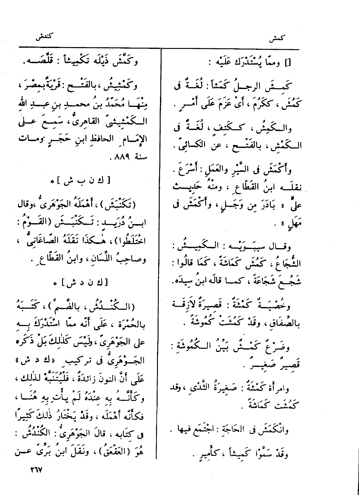 ومِمّا يُسْتَدْرَك عَلَيْه: كَمِشَ الرجلُ كَمَشاً: لُغَةٌ فِي كَمُشَ، ككَرُمَ، أَيْ عَزَمَ عَلَى أَمْرٍ. والكَمِشُ، ككَتِفٍ، لُغَةٌ فِي)