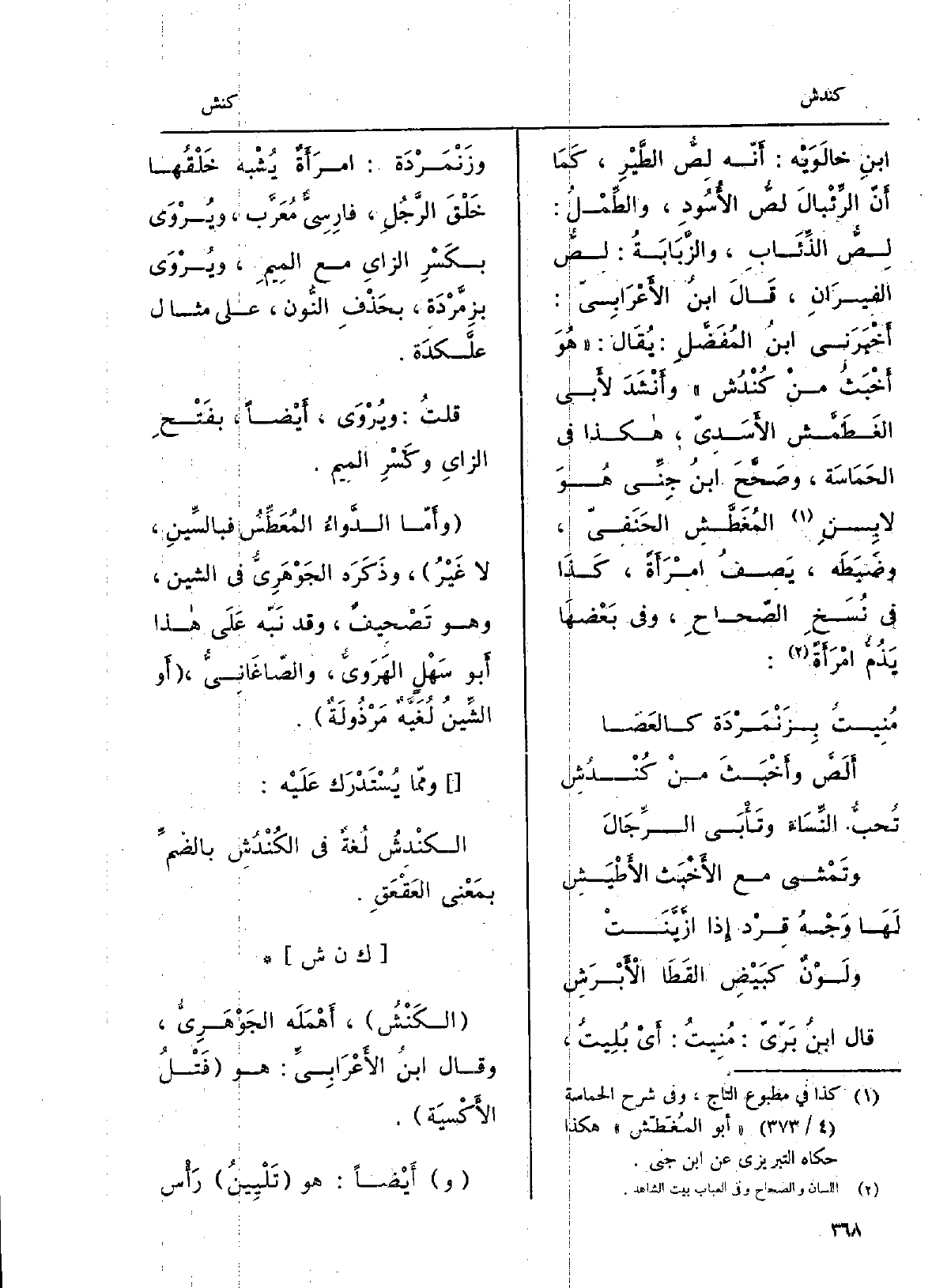 ابنِ خالَوَيْه: أَنّه لصُّ الطَّيْرِ، كَمَا أَنّ الرِّئْبالَ لِصُّ الأُسُودِ، والطِّمْلُ: لِصُّ الذِّئَابِ، والزَّبَابَةُ: لِصُّ الفِيرَانِ، قالَ ابنُ الأَعْرَابِيّ: أَخْبَرني ابنُ المُفَضَّلِ: يُقَال: هُوَ أَخْبَثُ منْ كُنْدُش وأَنْشَدَ لأَبي الغَطْمَّش الأَسَدِيّ، هَكَذَا فِي الحَمَاسَة، وصَحَّحَ ابنُ جِنِّي هُوَ لابِنِ المُغَطِّشِ الحَنَفِيّ، وضَبَطَه، يَصِفُ امرْأَةً، كَذَا فِي نُسَخِ الصّحاحِ، وَفِي بَعْضِهَا يَذّمُّ امْرَأَةً: