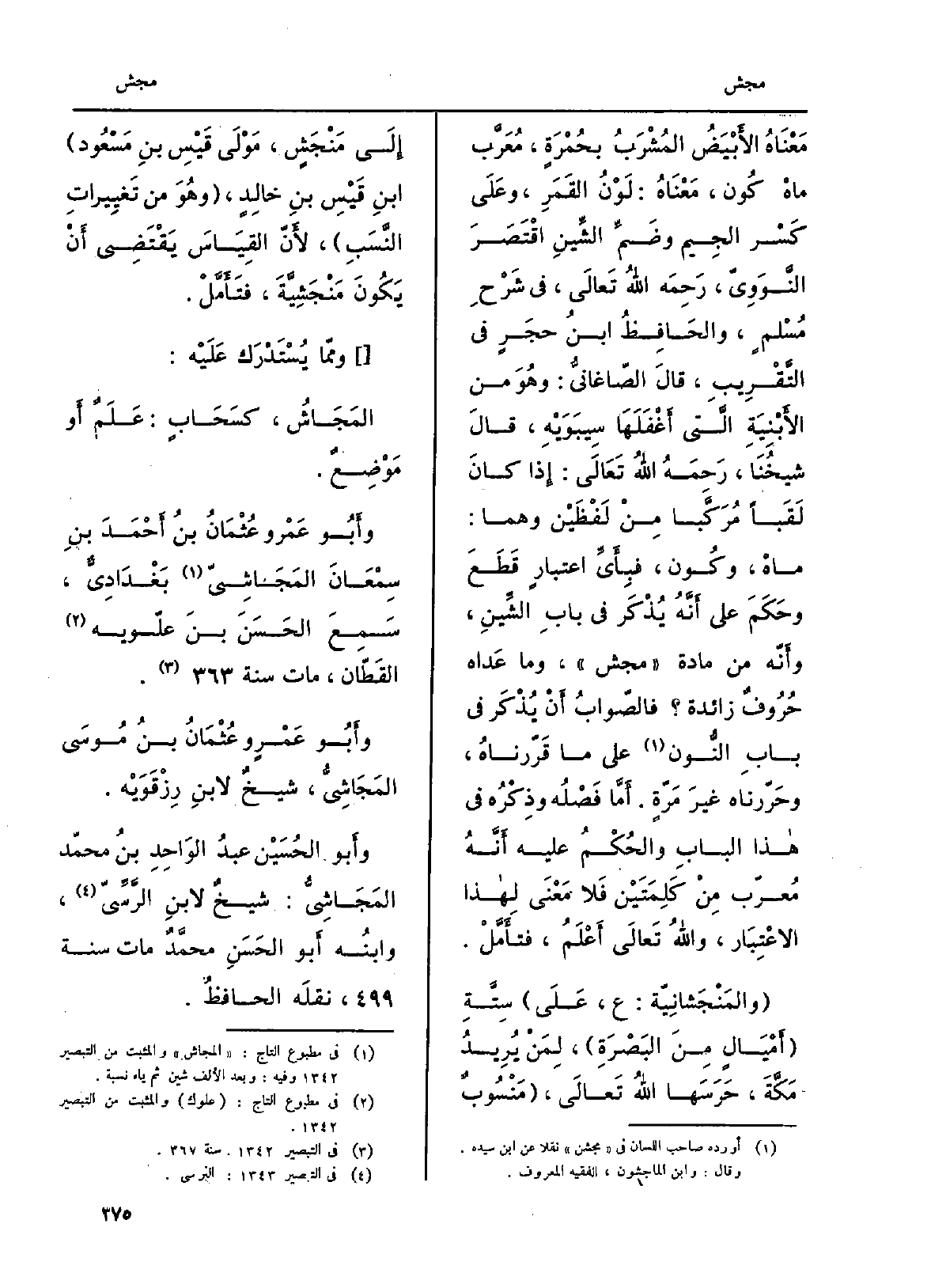 ِ مَعْنَاهُ الأَبْيَضُ المُشْرَبُ بحُمْرَةٍ، مُعَرَّب ماهْ كُون، مَعْنَاهُ: لَوْنُ القَمَرِ، وعَلَى كَسْر الجِيم وضَمِّ الشِّينِ اقْتَصَرَ النَّوَوِيّ، رَحِمَه اللهُ تَعالَى، فِي شَرْحِ مُسْلمٍ، والحَافِظُ ابنُ حجَرٍ فِي التَّقْرِيبِ، قالَ الصّاغَانِيُّ: وهُوَ من الأَبْيِنَةِ الَّتي أَغْفَلَهَا سِيبَوَيْهِ، قالَ شَيخُنَا، رَحِمَهُ اللهُ تَعَالَى: إِذا كانَ لَقَباً مُرَكَّباً مِنْ لَفْظَيِن وهما: ماهْ، وكُون، فبِأَيِّ اعتبارٍ قَطَعَ وحَكَمَ على أَنَّهُ يُذْكَر فِي بابِ الشِّينِ، وأَنّه من مَادَّة مجش، وَمَا عَداه حُرُوفٌ زَائِدَة فالصّوابُ أَنْ يُذْكَر فِي بابِ النُّون على مَا قَرّرناهُ، وحَرّرناه غيرَ مَرّةٍ. أَمَّا فَصْلُه وذِكْرُه فِي هَذَا البابِ والحُكْمُ عَلَيْهِ أَنَّهُ مُعرّب مِنْ كَلِمَتِيْنِ فَلا مَعْنَى لِهذا الاعْتِبَار، واللهُ تَعَالَى أَعْلَمُ، فتَأَمَّلْ. والمَنْجَشانِيّة: ع، عَلَى سِتَّةِ أَمْيَالٍ مِنَ البَصْرَةِ، لِمَنْ يُرِيدُ مَكَّةَ، حَرَسَها اللهُ تَعَالَى، مَنْسُوبٌ إِلَى مَنْجَشٍ، مَوْلَى قَيْسِ بنِ مَسْعُود ابنِ قَيْسِ بنِ خالِدٍ، وهُوَ من تَغيِيراتِ النَّسَبِ، لأَنّ القِيَاسَ يَقْتَضِي أَنْ يَكُونَ مَنْجَشِيَّةَ، فتَأَمَّلْ. وممّا يُسْتَدْرَك عَلَيْه: المَجَاشُ، كسَحَابٍ: عَلَمٌ أَو مَوْضِعٌ. وأَبُو عَمْرو عًثْمَانُ بنُ أَحْمَدَ بنِ سِمْعَانَ المَجَاشِيّ بَغْدَادِيٌّ، سَمِعَ الحَسَنَ بنَ علّويه القَطّان، مَاتَ سنة. وأَبُو عَمْروٍ عُثْمَانُ بنُ مُوْسَى المَجَاشِيُّ، شيخٌ لابنِ رِزْقَوَيْه. وأَبو الحُسَيْن عبدُ الوَاحِدِ بنُ محمّد المَجَاشِيُّ: شيخٌ لابنِ الرَّسِّيّ، وابنُه أَبو الحَسَنِ محمَّدٌ مَاتَ سنة، نَقَلَه الحافظُ.