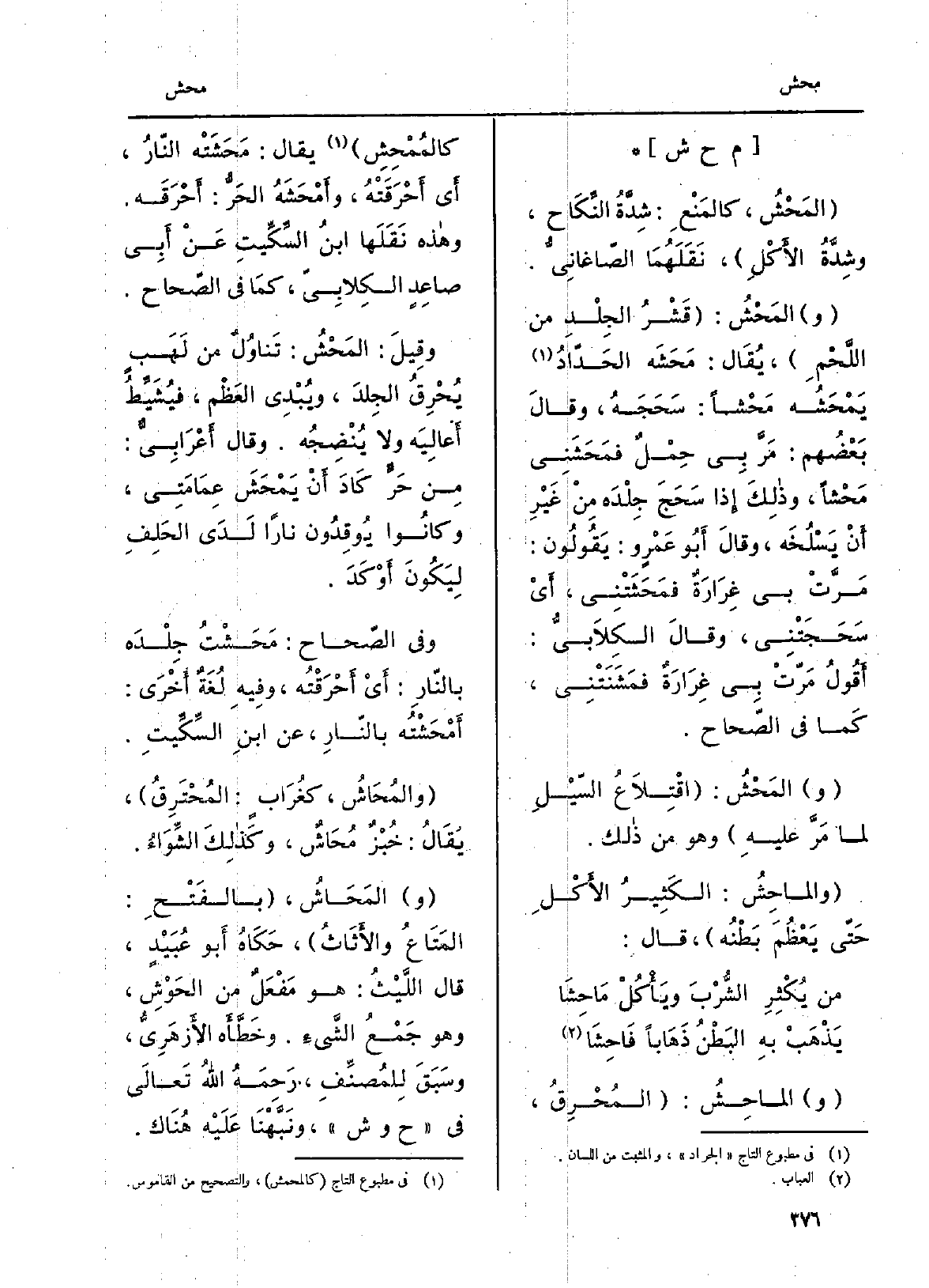 والماحِشُ: المُحْرِقُ، كالمُمْحِشِ يُقَال: مَحَشَتْه النّارُ، أَي أَحْرَقَتْهُ، وأَمْحَشَهُ الحَرُّ: أَحْرَقَه. وَهَذِه نَقَلَها ابنُ السِّكِّيتِ عَنْ أَبِي صاعِدٍ الكِلابِيّ، كمَا فِي الصّحاح. وقِيلَ: المَحْشُ: تَناوُلٌ من لَهَبٍ يُحْرِقُ الجِلْدَ، ويُبْدِي العَظْم، فيُشَيِّطُ أَعالِيَه وَلَا يُنْضِجُه. وَقَالَ أَعْرَابِيٌّ: مِن حَرٍّ كَادَ أَنْ يَمْحَشَ عِمَامَتِي، وكانُوا يُوقِدُون نَارا لدَى الحَلِفِ لِيَكُونَ أَوْكَدَ. وَفِي الصّحاح: مَحَشْتُ جِلْدَه بالنّارِ: أَيْ أَحْرَقْتُه، وفيهِ لُغَةٌ أُخْرَى: أَمْحَشْتُه بالنّارِ، عَن ابنِ السِّكِّيتِ. والمُحَاشُ، كغُرَابٍ: المُحْتَرِقُ، يُقَالُ: خُبْز مُحَاشٌ، وكذلِكَ الشِّوَاءُ. والمَحَاشُ، بالفَتْحِ: المَتَاعُ والأَثَاثُ، حَكَاهُ أَبو عُبَيْدٍ، قَالَ اللَّيْثُ: هُوَ مَفْعَلٌ من الحَوْشِ، وَهُوَ جَمْعُ الشَّيءِ وخَطَّأَه الأَزْهَرِيُّ، وسَبَقَ لِلمُصنِّفِ، رَحِمَهُ اللهُ تَعالَى فِي ح وش، ونَبَّهْنَا عَلَيْه هُنَاك.