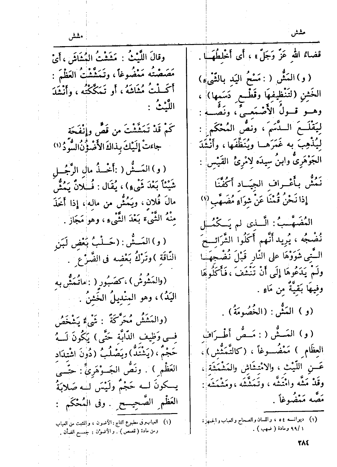 المُضَهَّبُ: الَّذِي لم يَكْمُل نُضْجُه، يُرِيد أَنَّهم أَكَلُوا الشَّرَائِحَ الَّتِي شَوَوْهَا على النّارِ قَبْلَ نُضْجِهَا ولَمْ يَدَعُوهَا إِلَى أَن تَنْشَفَ، فأَكَلُوهَا وفِيهَا بَقِيَّةٌُ مِن مَاءٍ. و} المَشُّ: الخُصُومَةُ. والمَشُّ: مَصُّ أَطْرَافِ العِظَامِ مَمضُوغاً، {كالتَّمَشُّشِ، عَنِ اللَّيْثِ،} والامْتِشَاشِ {والمَشْمَشَةِ، وقَدْ} مَشَّه {وامْتَشَّه،} وتَمَشَّشَه، {ومَشْمَشَه: مَصَّه مَمْضُوعاً. وقالَ اللَّيْثُ} مَشَشْتُ {المُشَاشَ، أَيْ مَصَصْتُه مَمْضُوغاً،} وتَمَشَّشْتُ العَظْمَ: أَكَلْتُ {مُشَاشَهُ، أَو تَمَكَّكْتُه، وأَنْشَدَ اللَّيْثُ: