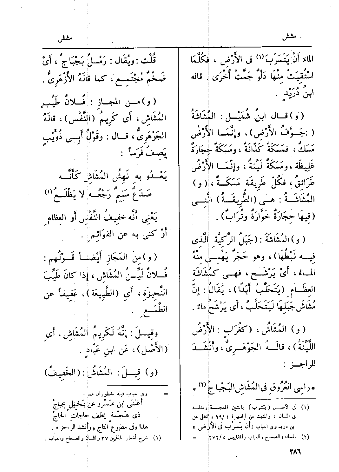 الماءَ أَنْ يَتَسَرّبّ فِي الأرْضِ، فكُلَّمَا اسْتُقِيَتْ مِنْهَا دَلْوٌ جَمَّتْ أُخْرَى. قَالَه ابنُ دُرَيْدٍ. وَقَالَ ابنُ شُمَيْل: المُشَاشَةُ: جَوْفُ الأَرْضِ، وإِنَّمَا الأَرْضُ مَسَكٌ، فمَسَكَةٌ كَذّانَةٌ، ومَسَكَةٌ حِجَارَةٌ غَلِيظَة، ومَسَكَةٌ لَيِّنةٌ، وإِنّمَا الأَرْضُ طَرَائِقُ، فكُلّ طَرِيقَة مَسَكَةٌ، والمُشَاشَةُ: هِيَ الطَّرِيقَةُ الَّتِي فِيهَا حِجَارضةٌ خَوّارَةٌ وتُرَابٌ. والمُشَاشَةُ: جَبَلُ الرَّكِيَّةِ الَّذِي فِيهِ نَبْطُهَا، وَهُوَ حَجَرٌ يَهْمِي مِنْهُ الماءُ، أَي يَرْشَح، فَهِيَ {كمُشَاشَةِ العِظَامِ يَتَحَلَّبُ أَبَداً، يُقَالُ: إِنّ} مُشَاشَ جَبَلِهَا لَيَتَحَلَّبُ، أَي يَرْشَحُ مَاء.