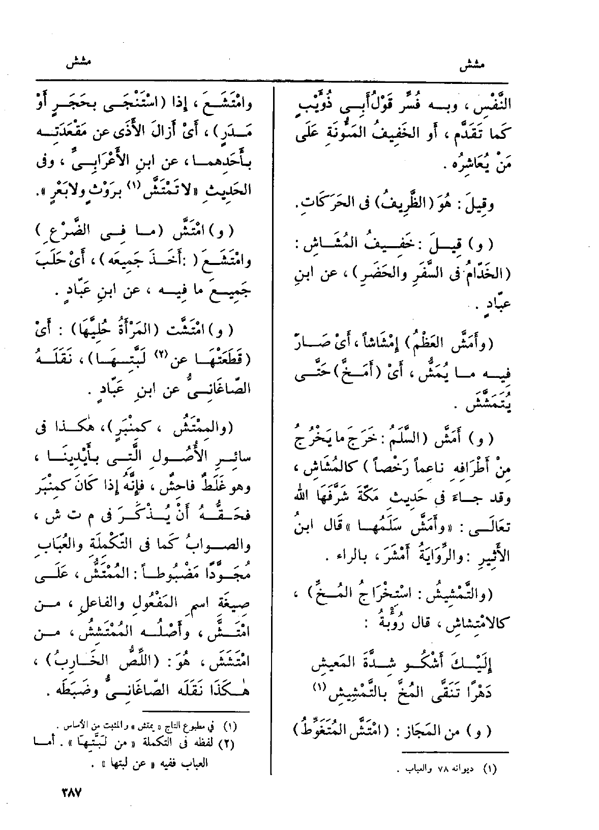 وَمن المَجَاز:} امْتَشَّ المُتَغَوِّطُ وامْتَشَعَ، إِذا اسْتَنْجَى بحَجَرٍ أَوْ مَدَرٍ، أَيْ أَزالَ الأَذَى عَن مَقْعَدَتِه بأَحَدِهما، عَن ابنِ الأَعْرَابِيِّ، وَفِي الحَدِيثِ لَا {تَمْتَشَّ برَوْثٍ وَلَا بَعْرٍ. و} امْتَشَّ مَا فِي الضَّرْعِ وامْتَشَعَ: أَخَذَ جَمِيعَه، أَيْ حَلَبَ جَمِيعَ مَا فِيه، عَن ابنِ عَبّادٍ. و {امْتَشَّت المَرْأَةُ حُلِيَّهَا: أَيْ قَطَعَتْهَا عَن لَبَّتِهَا، نَقَلَهُ الصّاغَانِيُّ عَن ابنِ عَبّادٍ. والمِمْتَشُ، كمِنْبَرٍ، هَكَذَا فِي سائِرِ الأُصُولِ الَّتِي بأَيْدِينَا، وَهُوَ غَلَطٌ فاحِشٌ، فإِنَّهُ إِذا كَانَ كمِنْبَر فحَقُّهُ أَنْ يُذْكَرَ فِي م ت ش، والصوابُ كَما فِي التَّكْمِلَةِ والعُبَابِ مُجَوَّداً مَضْبُوطاً:} المُمْتَشُّ، عَلَى صِيغَةِ اسمِ المَفْعُولِ والفاعِلِ، من امْتَشَّ، وأَصْلُه المُمْتَشِشُ، من! امْتَشَشَ، هُوَ: اللِّصُّ الخَارِبُ، هكَذَا نَقَلَه الصّاغَانِيُّ وضَبَطَه.