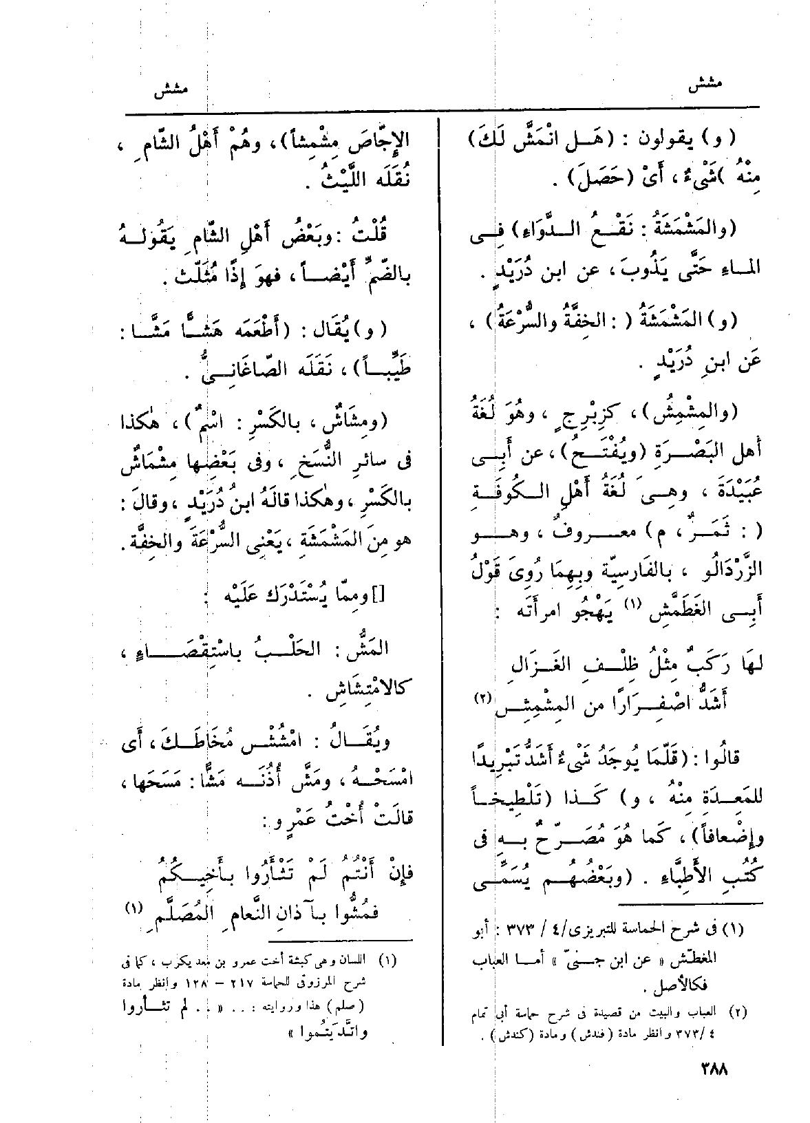 } ومِشَاشٌ، بالكَسْرِ: اسْمٌ، هَكَذَا فِي سائِرَ النُّسَخِ، وَفِي بَعْضِها {مِشْمَاشٌ بالكَسْرِ، وَهَكَذَا قالَهُ ابنُ دُرَيْدٍ، وقالَ: هُوَ مِنَ} المَشْمَشَةِ، يَعْنِي السُّرْعَةَ والخِفَّة. ومِمّا يُسْتَدْرَك عَلَيْه: {المَشُّ: الحَلْبُ باسْتِقْصَاءٍ،} كالامْتِشَاش. ويُقَالُ: {امْشُشْ مُخَاطَكَ، أَي امْسَحْهُ،} ومَشَّ أُذُنَه {مَشّاً: مَسَحَها، قالَتْ أُخْتُ عَمْروٍ: