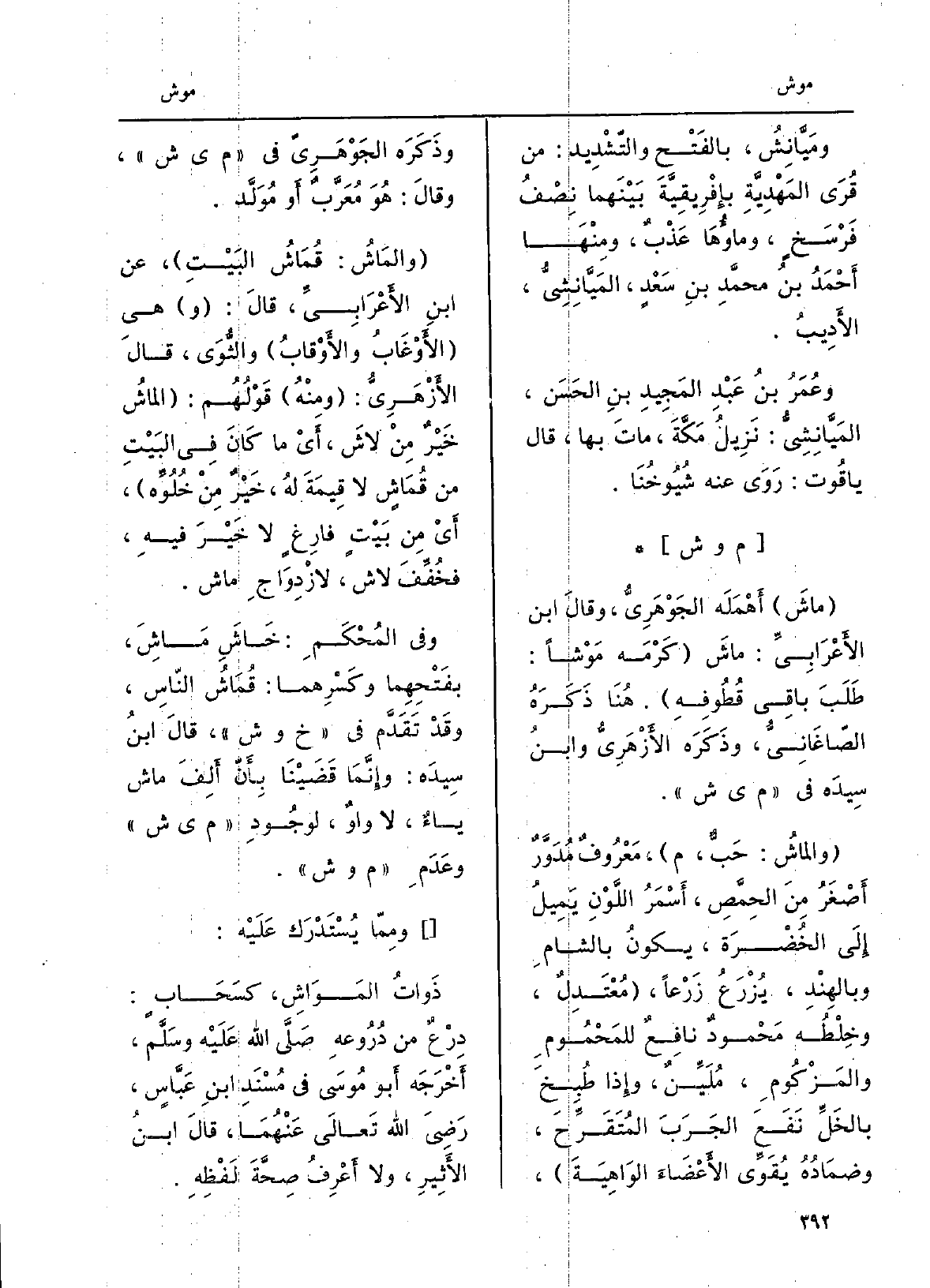 . {ماشَ أَهْمَلَه الجَوْهَرِيُّ، وقالَ ابْن الأَعْرَابِيِّ: ماشَ كَرْمَه} مَوْشاً: طَلَبَ باقِي قُطُوفِهِ. هُنَا ذَكَرَهُ الصّاغَانِيُّ، وذَكَرَه الأَزْهَرِيُّ وابنُ سِيدَه فِي م ي ش. {والماشُ: حَبٌّ، م، مَعْرُوفٌ مُدَوَّرٌ أَصْغَرُ مِنَ الحِمَّصِ، أَسْمَرُ اللَّوْنِ يَمِيلُ إِلَى الخُضْرَة، يكونُ بالشامِ وبالهِنْدِ، يُزْرَعُ زَرْعاً، مُعْتَدِلٌ، وخِلْطُه مَحْمودٌ نافِعٌ للمَحْمُومِ والمَزْكُومِ، مُلَيِّنٌ، وإِذا طُبِخَ بالخَلِّ نَفَعَ الجَرَبَ المُتَقَرِّحَ، وضمَادُهُ يُقَوِّي الأَعْضَاءَ الوَاهِيَةَ، وذَكَرَه الجَوْهَرِيُ فِي م ي ش، وقالَ: هُوَ مُعَرَّبٌ أَو مُوَلَّد. والمَاشُ: قُمَاشُ البَيْتِ، عَن ابنِ الأَعْرَابِيِّ، قالَ: وَهِي الأَوْغَابُ والأَوْقابُ والثُّوَى، قالَ الأَزْهَرِيُّ: ومِنْهُ قَوْلُهُم: الماشُ خَيْرٌ مِنْ لاشَ، أَيْ مَا كَانَ فِي البَيْتِ من قُمَاشٍ لَا قِيمَةَ لَهُ، خَيْرٌ مِنْ خُلُوِّه، أَيْ مِنْ بَيْتٍ فارِغٍ لَا خَيْرَ فيهِ، فخُفِّفَ لاش، لازْدِوَاجِ ماش. وَفِي المُحْكَمِ: خَاشَ مَاشَ، بفَتْحِهِما وكَسْرِهما: قُمَاشُ النّاسِ، وقَدْ تَقَدَّم فِي خَ وش، قالَ ابنُ سِيدَه: وإِنَّمَا قَضَيْنَا بِأَنّ أَلِفَ ماش ياءٌ، لَا واوٌ، لوجُودِ م ي ش وعَدَمِ م وش. ومِمّا يُسْتَدْرك عَلَيْه: ذَواتُ} المَوَاشِ، كسَحَابٍ: دَرْعٌ من دُرُوعهِ صَلَّى الله عَلَيْه وسَلَّم، أَخْرَجَه أَبو مُوْسَى فِي مُسْنَدِ ابنِ عَبَّاسٍ، رَضِيَ الله تَعالَى عَنْهُمَا، قالَ ابنُ الأَثِيرِ، وَلَا أَعْرِفُ صِحَّةَ لَفْظِهِ.