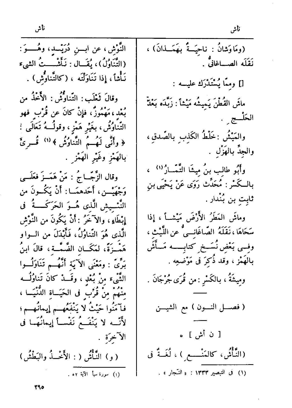 .} النَّأْشُ، كالمَنْعِ، لُغَةٌ فِي النَّوشِ، عَن ابنِ دُرَيْدٍ، وهُوَ: التَّنَاوُلُ، يُقَال: {نَأَشْتُ الشيءَ} نَأْشاً، إِذا تَنَاوَلْتَه، كالتَّناؤُشِ. وقالَ ثَعْلَب: {التَّناؤُشُ الأَخْذُ من بُعْدٍ مَهْمُوز، فإِنْ كانَ عَن قُرْبٍ فَهُوَ التّناؤُشُ، بغَيْرِ هَمْزٍ، وقَولُهُ تَعَالَى: وأَنَّي لَهُمُ التَّناؤُشُ قُرِئَ بالهَمْزِ وغَيْرِ الهَمْزِ. وَقَالَ الزَّجّاجُ: مَنْ هَمَزَ فَعَلَى وَجْهَيْن، أَحَدهمَا: أَنْ يَكُونَ من} النَّئيِشِ الَّذي هُوَ الحَرَكَةُ فِي إِبْطَاءٍ، والآخَرُ: أَنْ يَكُونَ من النَّوْشِ الَّذِي هُوَ التّناوُلُ، فَأَبْدَلَ من الْوَاو هَمْزَةً، لمَكَانِ الضَّمَّةِ، قالَ ابنُ بَرِّيّ: ومَعْنَى الآيَةِ أَنَّهُم تَنَاوَلُوا الشَّيْءَ مِنْ بُعْدٍ، وقَدْ كانَ تَناوُلُه مِنْهُمْ مِنْ قُرْبٍ فِي الحَيَاةِ الدُّنْيَا، فآمَنُوا حَيْثُ لَا يَنْفَعَهُم إِيمانُهم لأَنّه لَا يَنْفَعُ نَفْساً إِيمانُهَا فِي الآخِرَةِ. والنَّأْشُ: الأَخْذُ والبَطْش