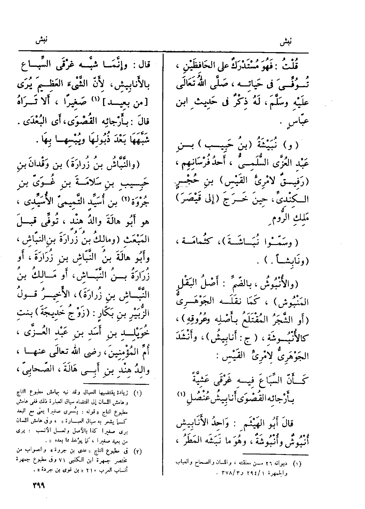 قالَ أَبُو الهَيْثَمِ: وَاحِدُ الأَنَابِيشِ أُنْبُوشٌ وأُنْبُوشَةٌ، وهُوَ مَا نَبَشَه المَطَرُ، قَالَ: وإِنَّمَا شبَّه غَرْقَى السِّباع بالأَنَابِيشِ، لأَنّ الشَّيْءَ العَظِيمَ يُرَى من بعِيد صَغِيراً، أَلا تَرَاهُ قالَ: بأَرْجائِه القُصْوَى، أَي البُعْدَي. شَبَّهَهَا بَعْدَ ذُبُولِهَا ويُبْسِها بِهَا. والنَّبَّاشُ بنُ زُرارَةَ بن وَقْدانَ بنِ حَبِيبِ بنِ سَلاَمَةَ بنِ غُوَىّ بنِ جُرْوَة بن أُسَيِّدٍ التَّمِيميّ الأُسَيِّدِي، هُوَ أَبُو هالَةَ والدُ هِنْدٍ، تُوفِّي قبلَ المَبْعَثِ ومالِكُ بنُ زُرارَةَ بنِ النَبّاشِ، وأَبُو هالَةَ بنُ النَّبّاشِ بنِ زُرَارَةَ، أَو زُرَارَةُ بنُ النَّبّاشِ، أَو مَالِكُ بنُ النَّبّاشِ بنِ زُرارَةَ، الأَخِيرُ قولُ الزُّبَيْرِ بنِ بَكّارٍ: زَوْجُ خَدِيجَةَ بنتِ خُوَيْلِدِ بنِ أَسَدِ بنِ عَبْدِ العُزَّي، أُمِّ المُؤْمِنينَ، رَضِي الله تَعالَى عَنْهَا، والِدُ هِنْدِ بنِأَبِي هَالَةَ، الصّحابِيّ،