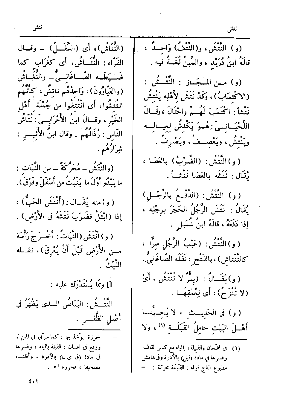 والنَّتْشُ: عَيْبُ الرَّجُلِ سِرّاً، كالتَّنْتاشِ، بالفَتْحِ، نَقَلَه الصّاغَانِيُّ. ويُقَالُ: بِئْرٌ لَا تُنْتَشُ، أَيْ لَا تُنْزَحُ، أَيْ لِعُمْقِهَا. وَفِي الحَدِيثِ لَا يُحِبُّنا أَهْلَ البَيْتِ حامِلُ القَبَلَةِ، وَلَا النُّتّاشُ أَي السَّفَلُ وَقَالَ الفَرّاء: النُّتَاشُ، أَي كغُرَابٍ كَمَا ضَبَطَه الصّاغَانِيُّ والنُّعَاشُ والعَيّارُونَ، وَاحِدُهُم ناتِشٌ، كأَنَّهُم انتُتِشُوا، أَي انْتُتِفُوا من جُمْلَةٍ أَهْلِ الخَيْرِ، وقالَ ابنُ الأَعْرَابِيّ، نُتّاشُ النّاسِ: رُذَالُهُم. وَقَالَ ابنُ الأَثِيرِ: شِرَارُهُم. والنَّتَشُ مُحَرَّكَةً من النَّبَاتِ: مَا يَبْدُو أَوّلَ مَا يَنْبُتُ من أَسْفَلَ وفَوْقَ. وَمِنْه يُقَال: أَنْتَشَ الحَبُّ، إِذا ابْتَلَّ فَضَرَبَ نَتَشَهُ فِي الأَرْضِ. وأَنْتَشَ النَّبَاتُ: أَخْرَجَ رَأْسَه من الأَرْضِ قَبْلَ أَنْ يُعْرِقَ، نَقله اللَّيْثُ. وممّا يُسْتَدْرَك عَلَيْهِ: النَّتْشُ: البَيَاضُ الَّذِي يَظْهَرُ فِي أَصْلِ الظُّفرِ.