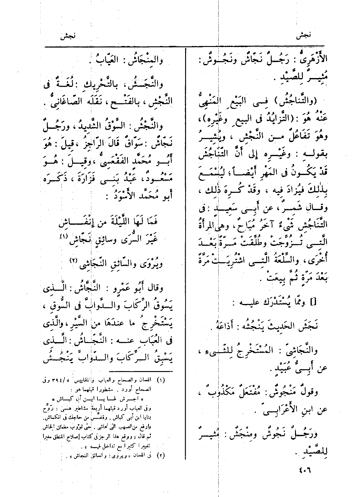 الأَزْهَرِيُّ: رَجُلٌ نَجّاشٌ ونَجُوشٌ: مُثِيرٌ لِلصَّيْدِ. والتَّناجُشُ فِي البَيْعِ المَنْهِىُّ عَنْهُ هُوَ: التَّزايُدُ فِي البيعِ وغَيْرِهِ، وهُوَ تَفَاعُلٌ من النَّجِشْ، ويُشِيرُ بقولهِ: وغَيْرِه إِلى أَنَّ التّنَاجُشَ قَدْ يَكُونُ فِي المَهْرِ أَيْضاً ليُسْمَع بذلِكَ فيُزَادَ فِيهِ، وقَدْ كُرِهَ ذلِكَ، وَقَالَ شَمِرٌ، عَن أَبِي سَعِيدٍ: فِي التَّنَاجُشِ شَيْءٌ آخَرُ مُبَاحٌ، وَهِي المرأَةُ الَّتِي تُزُوَّجَتْ وطُلِّقَتْ مَرّةً بَعْدَ أُخْرَى، والسِّلْعَةُ الَّتِي اشْتُرِيَتْ مَرَّةً بَعْدَ مَرّةٍ ثُمَّ بِيْعَتْ.