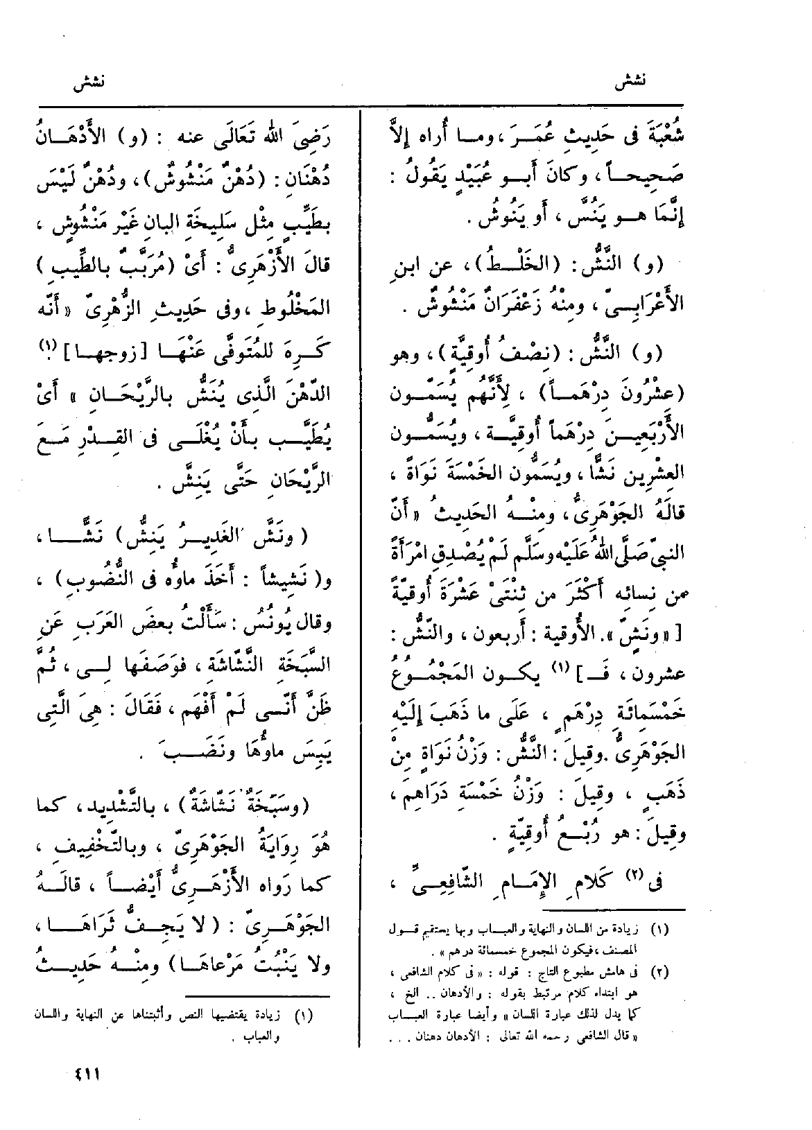 شُعْبَةَ فِي حَدِيثِ عُمَرَ، وَمَا أَراه إِلاَّ صَحِيحاً، وكانَ أَبو عُبَيْدٍ يَقُولُ: إِنَّمَا هُوَ يَنُسَّ، أَو يَنُوشُ. والنَّشُّ: الخَلْطُ، عَن ابنِ الأَعْرَابِيّ، ومِنْهُ زَعْفَرَانٌ مَنْشُوشٌ. والنَّشُّ: نِصْفُ أُوقِيَّهٍ، وَهُوَ عِشْرُونَ دِرْهَماً، لأَنَّهُم يُسَمّون الأَرْبَعِينَ دِرْهَماً أُوقِيَّة، ويُسَمُّون العِشْرِين {نَشّاً، ويُسَمُّون الخَمْسَةَ نَوَاةً، قالَهُ الجَوْهَرِيُّ، ومِنْهُ الحَدِيثُ أَنّ النبيّ صَلَّى اللهُ عَلَيْه وسَلَّم لَمْ يُصَدِق امْرَأَةً من نِسائِه أَكْثَر من ثِنْتَيْ عَشَرَةَ أُوقيّةً} ونَشٍ. الأُوقية: أَربعون، {والنّشُّ: عشرُون، فَ يكون المَجْمُوُعُ خَمْسَمِائَة دِرَْهمٍ، عَلَى مَا ذَهَبَ إِلَيْهِ الجَوْهَرِيُّ. وقِيلَ: النَّشُّ: وَزْنُ نَوَاةٍ مِنْ ذَهَبٍ، وقِيلَ: وَزْنُ خَمْسَةِ دَرَاهِمَ، وقَيلَ: هُوَ رُبْعُ أُوقيّةٍ. فِي كَلامِ الإِمَامِ الشّافِعِيِّ، رَضِيَ الله تَعَالَى عَنهُ: والأَدْهَانُ دُهْنَانِ: دُهْنٌ} مَنْشُوشٌ، ودُهْنٌ لَيْسَ بطَيِّبٍ مِثْل سَلِيخَةِ البانِ غَيْرَ مَنْشُوشٍ، قالَ الأَزْهَرِيُّ: أَيْ مُرَيَّبٌ بالطِّيبِ المَخْلُوطِ، وَفِي حَدِيثِ الزُّهْرِيّ أَنّه كَرِهَ للمُتَوفَّى عَنْهَا زوجه الدّهْنَ الَّذِي {يُنَشُّ بالرَّيْحَانِ أَيْ يُطَيَّب بأَنْ يُغْلَى فِي القِدْرِ مَعَ الرَّيْحَانِ حَتَّى يَنِشَّ.} ونَشَّ الغَدِيرُ {يَنِشُّ} نَشّاً، {ونَشِيشاً: أَخَذَ ماؤُه فِي النُّضُوبِ، وَقَالَ يُونُسُ: سَأَلْتُ بعضَ العَرَبِ عَنِ السَّبَخَةِ} النَّشّاشَةِ، فوَصَفَهَا لِي، ثُمَّ ظَنَّ أَنّي لَمْ أَفْهَم، فَقَالَ: هِيَ الَّتِي يَبِسَ ماؤُهَا ونَضَبَ. وسَبَخَةٌ! نَشّاشَةٌ، بالتَّشْدِيد، كَمَا هُوَ رِوَايَةُ الجَوْهَرِيُّ، وبالتّخْفِيفِ، كَمَا رَواه الأَزْهَرِيُّ أَيْضاً، قالَهُ الجَوْهَرِيّ: لَا يَجِفُّ ثَرَاهَا، وَلَا يَنْبُتُ مَرْعاهَا ومِنْهُ حَدِيثُ