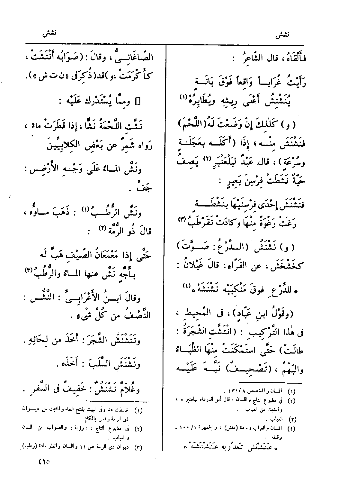 وكَذلِكَ إِنْ وَضَعْتَ لَهُ اللَّحْمَ} فنَشْنَشَ مِنْه إِذَا أَكَلَه بعَجَلَةٍ وسُرْعَةٍ، قَالَ عَبْدٌ لبَلْعَنْبَرِ يَصِفُ حَيّةً نَشَطَتْ فِرْسِنَ بَعِيرٍ: