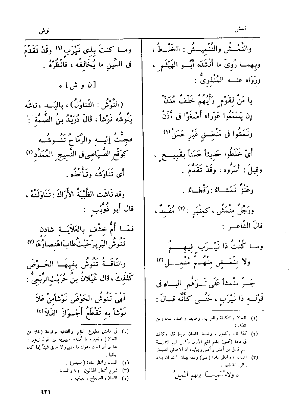 والنَّمْشُ والتَّنْمِيشُ: الخَلْطُ، وبِهما رُوِىَ مَا أَنْشَدَه أَبُو الهَيْثَمِ، ورَوَاه عَن المُنْذِرِيُّ: يَا مَنْ لِقَوْمٍ رَأْيُهُمْ خَلْفٌ مُدَنْ) إِن يَسْمَعُوا عَوْراءَ أَصْغَوْا فِي أَذَنْ ونَمَشُوا فِي مَنْطِقٍ غَيْرِ حَسَنْ أَيْ خَلَطُوا حَدِيثاً حَسَناً بقَبِيحٍ، وقِيلَ: أَسَرُّوه، وقَدْ تَقَدَّمَ. وعَنْزٌ نَمْشاءُ: رَقْطاءُ. ورَجُلٌ مِنْمَشٌ، كمِنْبَرٍ: مُفْسِدٌ، قالَ الشّاعر: