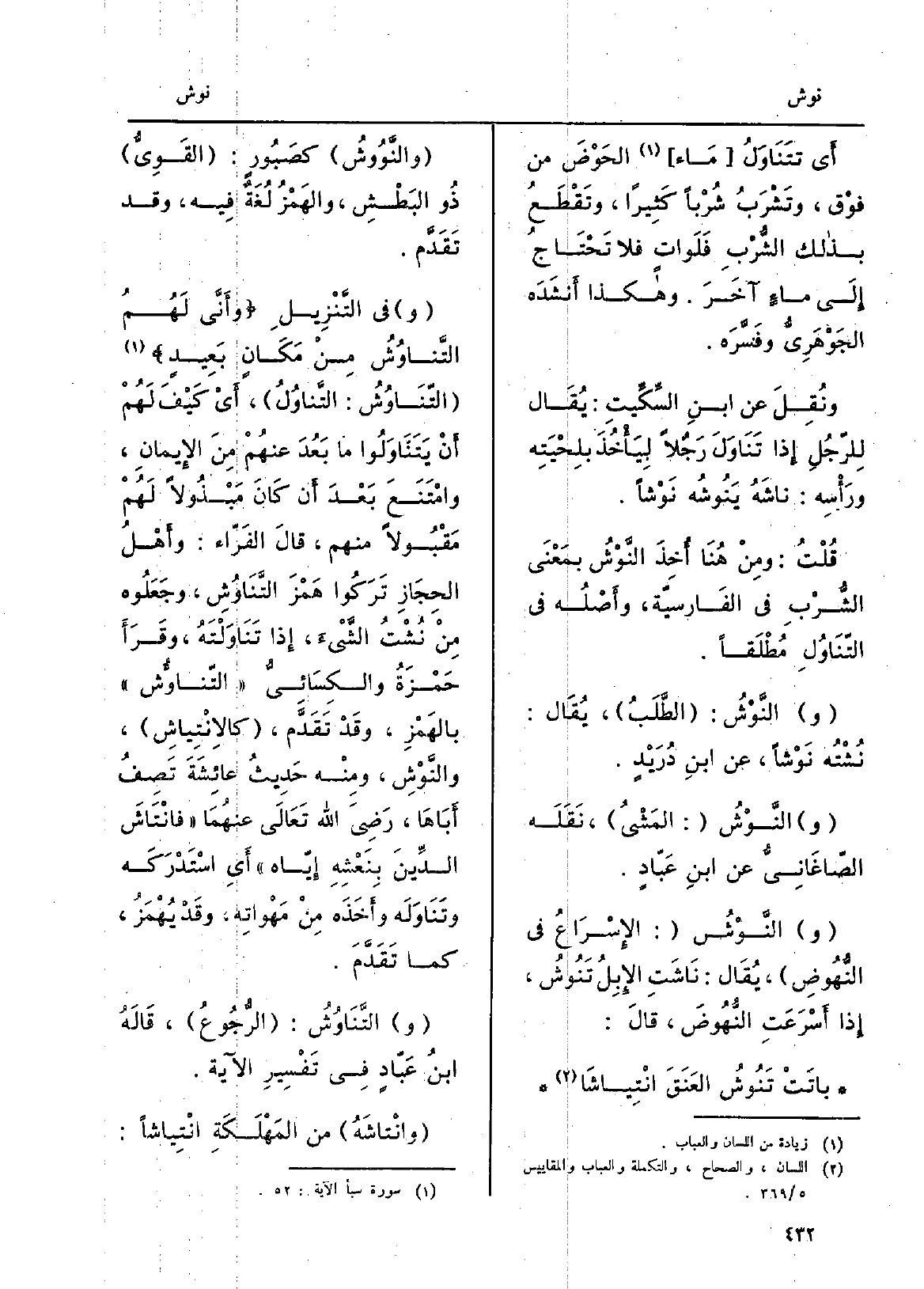 التّنَاوُشُ: التَّناوُلُ، أَيْ كَيْفَ لَهُمْ أَنْ يَتَنَاوَلُوا مَا بَعُدَ عنهُمْ مِنَ الإِيمانِ، وامْتَنَعَ بَعْدَ أَن كَانَ مَبْذُولاً لَهُمْ مَقْبُولاً مِنْهُم، قالَ الفَرّاء: وأَهْلُ الحِجَازِ تَرَكُوا هَمْزَ التَّنَاوُشِ، وجَعَلُوه مِن} نُشْتُ الشَّئَ، إِذا تَنَاوَلْتَهُ، وقَرَأَ حَمْزَةُ والكِسَائِيُّ التّناؤُش بالهَمْزِ، وقَدْ تَقَدّم، {كالاِنْتِياشِ،} والنَّوْشِ، ومِنْه حَدِيثُ عائِشَةَ تَصِفُ أَبَاها، رَضِيَ الله تَعَالَى عنهُمَا {فانْتَاشَ الدِّينَ بِنَعْشِهِ إِيّاه أَيِ اسْتَدْرَكَه وتَنَاوَلَه)