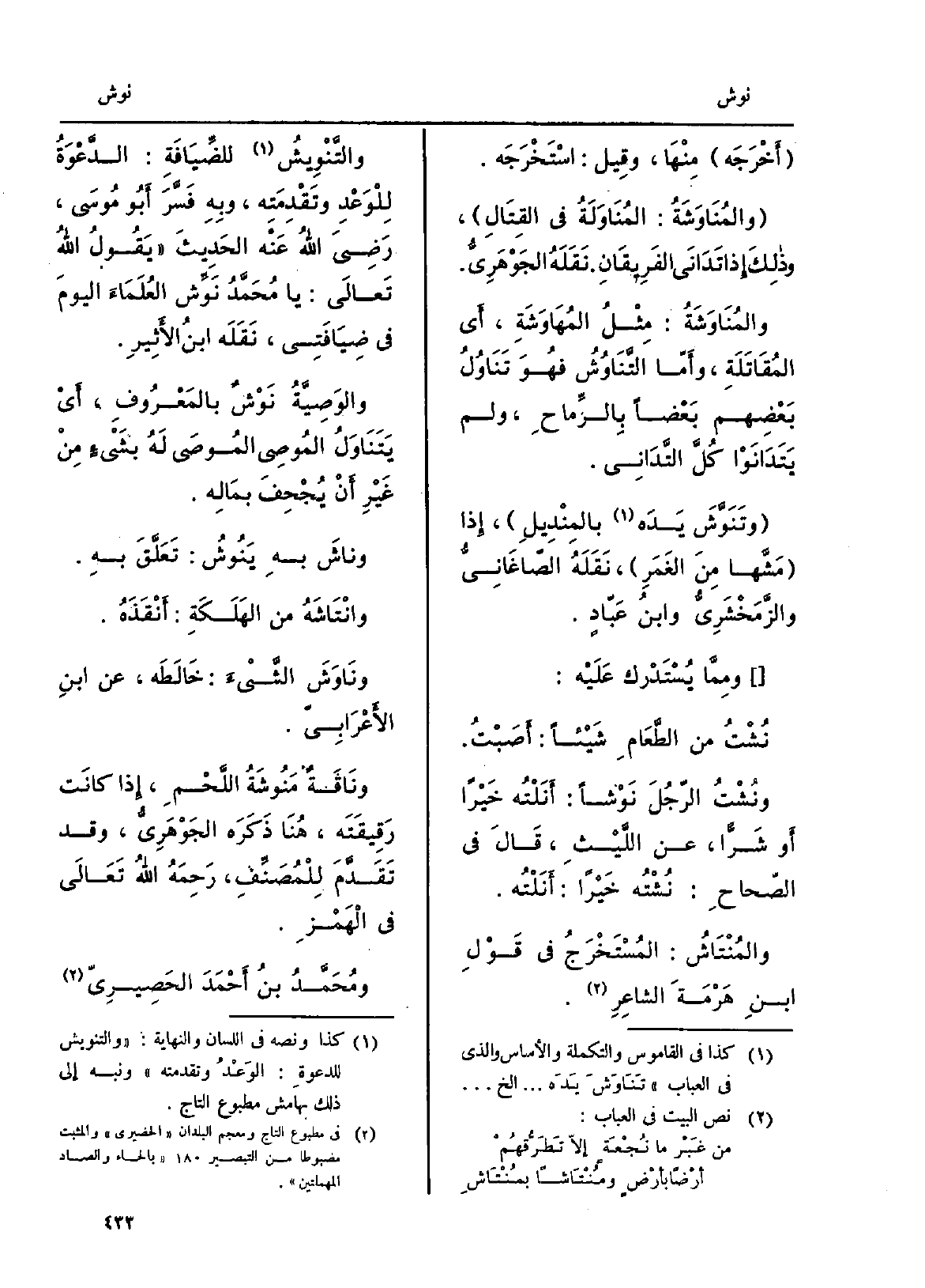 أَخْرَجَه مِنْهَا، وقِيل: اسْتَخْرَجَه. {والمُنَاوَشَةُ: المُنَاوَلَةُ فِي القِتَالِ، وذلِكَ إِذا تَدَانى الفَرِيقَانِ. نَقَلَهُ الجَوْهَرِيُّ.} والمُنَاوَشَةُ: مِثْلُ المُهَاوَشَةِ، أَي المُقَاتَلَةِ، وأَمّا {التَّنَاوُشُ فهُوَ تَنَاوُلُ بَعْضِهم بَعْضاً بِالرِّماحِ، وَلم يَتَدَانَوْا كُلَّ التَّدَانِي.} وتَنَوَّشَ يَدَه بالمِنْدِيلِ، إِذا مَشَّها مِنَ الغَمَرِ، نَقَلَهُ الصّاغَانِيُّ والزَّمَخْشَرِيُّ وابنُ عَبّادٍ. ومِمَّا يُسْتَدْرَك عَلَيْه: {نُشْتُ من الطَّعَامِ شَيْئاً: أَصَبْتُ.} ونُشْتُ الرّجُلَ {نَوْشاً: أَنَلْتُه خَيْراً أَو شَرّاً، عَن اللَّيْثِ، قَالَ فِي الصّحاحِ:} نُشْتُه خَيْراً: أَنَلْتُه. {والمُنْتَاشُ: المُسْتَخْرَجُ فِي قَوْلِ ابنِ هَرْمَةَ الشاعِرِ.} والتَّنْوِيشُ للضِّيَافَةِ: الدَّعْوَةُ لِلوَعْدِ وتَقْدِمَتِه، وبِهِ فَسَّرَ أَبُو مُوسَى، رَضِيَ اللهُ عَنْه الحَدِيثَ يَقُولُ اللهُ تَعالَى: يَا مُحَمَّدُ {نَوَّش العُلَمَاءَ اليومَ فِي ضِيَافَتِي، نَقَلَه ابنُ الأَثِيرِ. والوَصِيَّةُ} نَوْشٌ بالمَعْرُوفِ، أَيْ يَتَنَاوَلُ المُوصِي المُوصَى لَهُ بشَيْءٍ مِنْ غَيْرِ أَنْ يُجْحِفَ بمَالِه. {وناشَ بهِ} يَنُوشُ: تَعَلَّقَ بهِ. {وانْتَاشَهُ من الهَلَكَةِ: أَنْقَذَهُ.} ونَاوَشَ الشَّيْءِ: خَالَطَه، عَن ابنِ الأَعْرَابِيّ. ونَاقَةٌ! مَنُوشَةُ اللَّحْمِ، إِذا كانَت رَقِيقَتَه، هُنَا ذَكَرَه الجَوْهَرِيُّ، وَقد تَقَدَّمَ لِلمُصَنِّفِ، رَحِمَهُ اللهُ تَعَالَى فِي الهَمْزِ. ومُحَمَّدُ بنُ أَحْمَدَ الحَصِيرِيّ