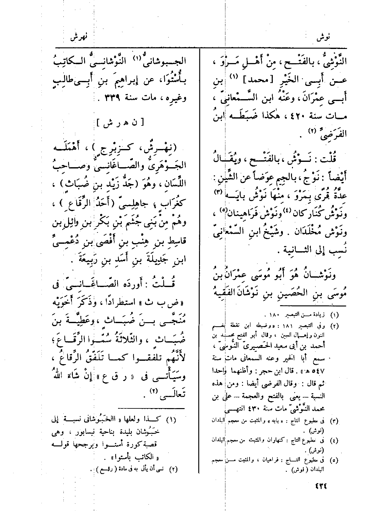 وشَيْخُ ابنِ السّمْعَانِيّ نُسِب إِلى الثانِية.} ونَوْشانُ هُوَ أَبُو مُوسَى عِمْرَانُ بنُ مُوسَى بنِ الحُصَينِ بنِ {نَوْشَانَ الفَقِيهُ الجبوشانيُّ} - النَّوْشانِيُّ الكاتِبُ بأَسْتُوَا، عَن إِبراهِيمَ بنِ أَبِي طالِبٍ وغيرِه، مَاتَ سنة.