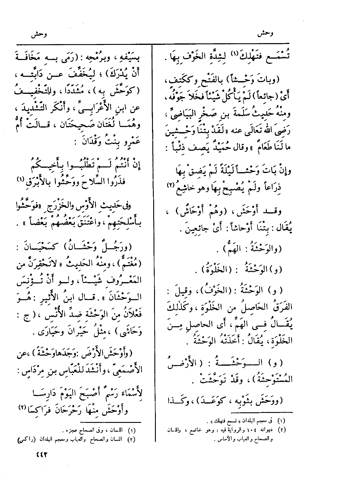 وَفِي حَدِيثِ الأَوْسِ والخَزْرَجِ} فوَحَّشُوا بأَسْلِحَتِهِمْ، واعْتَنَقَ بَعْضُهُمْ بَعْضاً. ورَجُلٌ {وَحْشَانُ كسَحْبَانَ: مُغْتَمٌّ، ومِنْهُ الحَدِيثُ لَا تَحْقِرَنَّ من المَعْرُوفِ شَيْئاً، وَلَو أَنْ تُؤْنِسَ} الوَحْشَانَ. قَالَ ابنُ الأَثِيرِ: هُوَ فَعْلاَنُ مِنَ الوَحْشَةِ ضِدِّ الأُنْسِ، ج: {وَحَاشَي، مِثْلُ حَيْرانَ وحَيَارَى.} وأَوْحَشَ الأَرْضَ: وَجَدَها {وَحْشَةً، عَن الأَصْمَعِيّ، وأَنْشَدَ للْعَبّاسِ بنِ مِرْدَاسٍ: