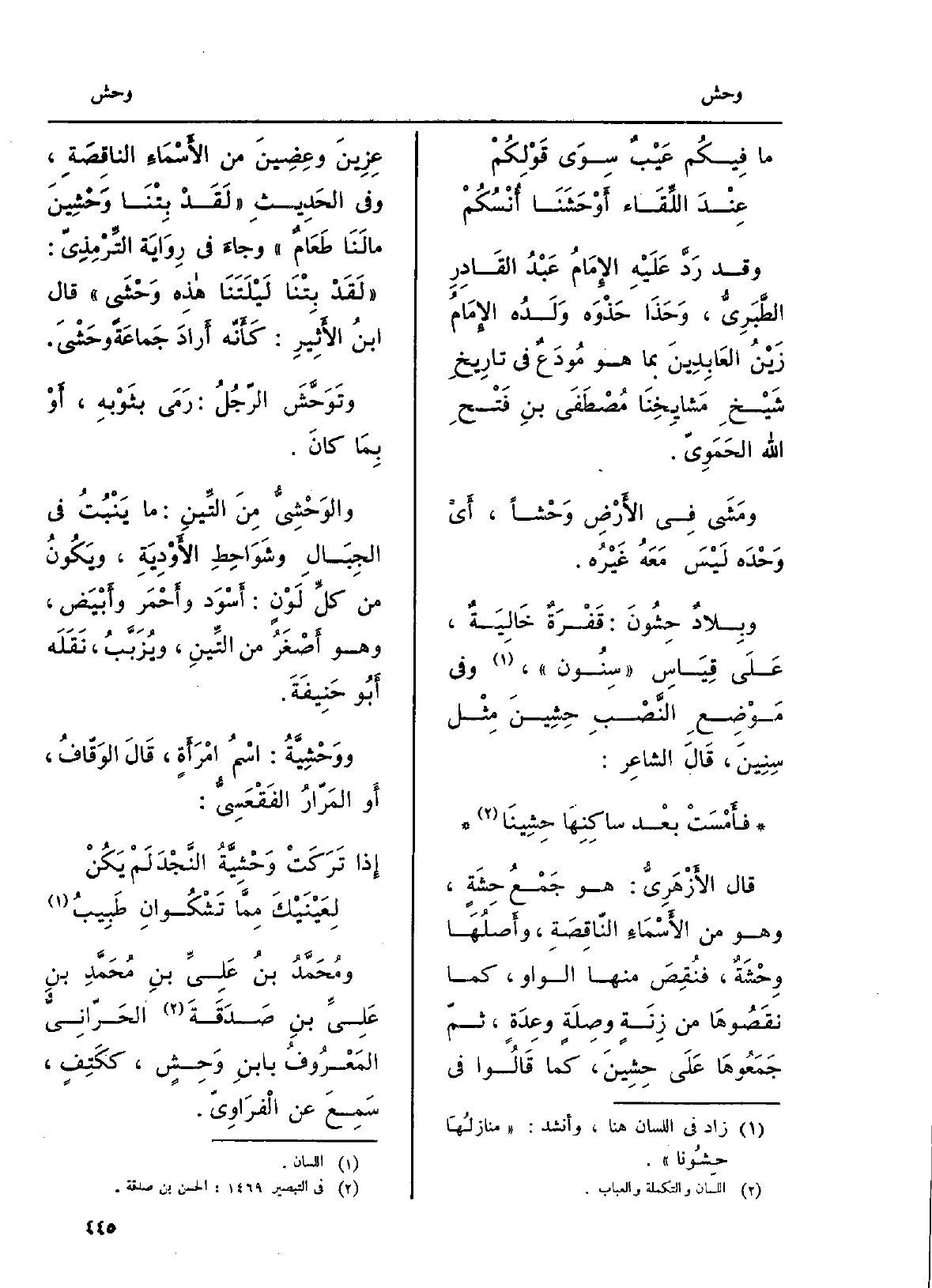 وَقد رَدَّ عَلَيْهِ الإِمَامُ عَبْدُ القَادِرِ الطَّبَرِيُّ، وَحَذَا حَذْوَه وَلَدُه الإِمَامُ زَيْنُ العَابِدِينَ بِمَا هُوَ مُودَعٌ فِي تارِيْخِ شَيْخِ مَشايِخِنَا مُصْطَفَى بنِ فَتْحِ الله الحَمَوِيّ. ومَشَى فِي الأَرْضِ} وَحْشاً، أَيْ وَحْدَه لَيْسَ مَعَهُ غَيْرُه. وبِلادٌ {حِشُونَ قَفْزَةٌ خَالِيَةٌ، عَلَى قِيَاسِ سِنُون، وَفِي مَوْضِعِ النَّصْبِ} حِشِينَ مِثْل سِنِينَ، قَالَ الشاعِر: فأَمْسَتْ بعْد ساكِنِهَا {حِشِينَا. قَالَ الأَزْهَرِيُّ: هُوَ جَمْعُ} حِشَةٍ، وَهُوَ من الأَسْمَاءِ النّاقِصَةِ، وأَصلُهَا وِحْشَةٌ، فنُقِصَ مِنْهَا الْوَاو، كَمَا نَقَصُوهَا من زِنَةٍ وصِلَةٍ وعِدَةٍ، ثمّ جَمَعُوهَا عَلَى حِشِينَ، كَمَا قَالُوا فِي عِزِينَ وعِضِينَ من الأَسْمَاءِ الناقِصَةِ، وَفِي الحَدِيثِ لَقَدْ بِتْنَا {وَحْشِينَ مَالَنَا طَعَام وجاءَ فِي رِوَايَة التَّرْمِذِيّ: لَقَدْ بِتْنَا لَيْلَتَنَا هذِه} وَحْشَي قَالَ ابنُ الأَثِيرِ: كَأَنّه أَرادَ جماعَةً وحَشْيَ. وتَوَحَّشَ الرَّجُلُ: رَمَى بثَوْبِهِ، أَوْ بِمَا كانَ. {والوَحْشِيُّ مِنَ التِّينِ: مَا يَنْبُتُ فِي الجِبَالِ وشَوَاحِطِ الأَوْدِيَةِ، ويَكُونُ من كلِّ لَوْنٍ: أَسْوَد وأَحْمَر وأَبْيَض، وَهُوَ أَصْغَرُ من التِّينِ، ويُزَيَّبُ، نَقَلَه أَبُو حَنِيفَةَ.} ووَحْشِيَّةُ: اسْمُ امْرَأَةٍ، قَالَ الوَقّافُ، أَو المَرّارُ الفَقْعَسِيُّ: