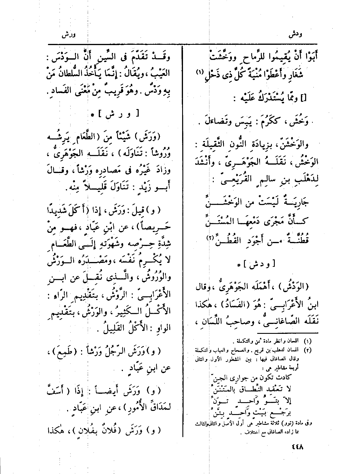} وَرَشَ شَيْئاً مِنَ الطَّعَامِ {يَرِشُه} وُرُوشاً: تَنَاوَلَه، نَقَلَه الجَوْهَرِيُّ، وزادَ غَيْرُه فِي مَصادِرِه {وَرْشاً، وقالَ أَبو زَيْدٍ: تَنَاوَلَ قَلِيلاً مِنْه. وقِيلَ: وَرَشَ، إِذا أَكَلَ شَدِيداً حَرِيصاً، عَن ابْنِ عَبّادٍ، فَهُوَ مِنْ شِدَّةِ حِرْصِه وشَهْوَتِه إِلَى الطَّعَامِ لَا يُكْرِمُ نَفْسَه، ومَصْدَرُه} الوَرْشُ {والوُرُوشُ، والَّذِي نُقِلَ عَن ابنِ الأَعْرَابِيّ: الرَّوْشُ، بتَقْدِيمِ الرّاءِ: الأَكْلُ الكَثِيرُ،} والوَرْشُ، بتَقْدِيمِ الواوِ: الأَكْلُ القَلِيلُ. {وَرَشَ الرَّجُلُ} وَرْشاً: طَمِعَ، عَن ابنِ عَبّادٍ. وَرَشَ أَيضاً: إِذَا أَسَفَّ لمَدَاقِّ الأُمُورِ، عنِ ابنِ عَبّادٍ. وَرَشَ فُلانٌ بفُلانٍ، هَكَذَا