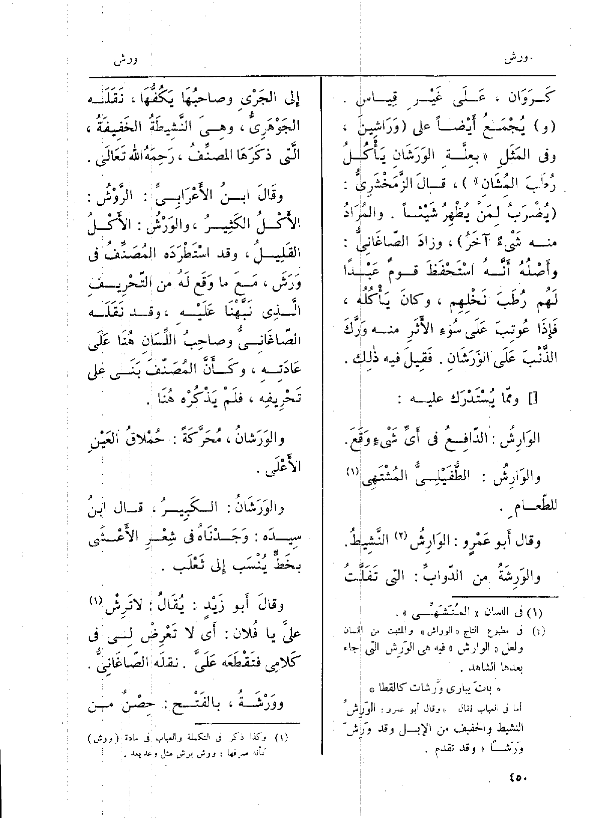 وَقَالَ أَبو عَمْروٍ: الوَارِشُ النَّشِيطُ {والوَرِشَةُ من الدّوابِّ: الَّتِي تَفَلَّتُ إِلى الجَرْيِ وصاحبُهَا يَكُفُّهَا، نَقَلَه الجَوْهَرِيُّ، وهِيَ النَّشِيطَةُ الخَفِيفَةُ، الَتي ذكَرَهَا المصنِّفُ، رَحِمَهُ الله تَعَالَى. وقَالَ ابنُ الأَعْرَابِيِّ: الرَّوْشُ: الأَكْلُ الكَثِيرُ،} والوَرْشُ: الأَكْلُ القَلِيلُ، وَقد اسْتَطْرَدَه المُصَنِّفُ فِي {وَرَشَ، مَعَ مَا وَقَع لَهُ من التّحْرِيفِ الَّذِي نَبَّهْنَا عَلَيْهِ، وَقد نَقَلَه الصّاغَانِيُّ وصاحِبُ اللِّسَانِ هُنَا عَلَى عَادَتِهِ، وكَأَنَّ المُصَنّفَ بَنَي على تَحْرِيفِه، فلَمْ يَذْكُرْه هُنَا.} والوَرَشانُ، مُحَرَّكَةً: حُمْلاقُ العَيْنِ الأَعْلَى. {والوَرَشَانُ: الكَبِيرُ، قَالَ ابنُ سِيدَه: وَجَدْنَاهُ فِي شِعْرِ الأَعْشَى بخَطٍّ يُنْسَب إِلى ثَعْلَب.