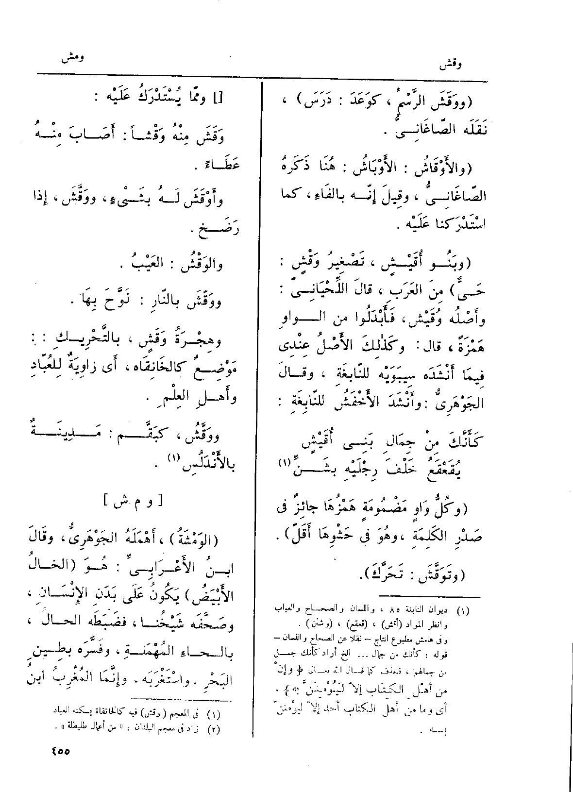 {والوَقْشُ: العَيْبُ.} ووَقّشَ بالنّارِ: لَوَّحَ بِهَا. وهِجْرَةُ {وَقَشٍ، بالتَّحْرِيكِ: مَوْضِعٌ كالخَانِقَاه، أَي زَاوِيَةٌ لِلعُبّادِ وأَهْلِ العِلْمِ.} ووَقَّشُ، كبَقَّم: مَدِينَةٌ بالأَنْدَلُسِ.