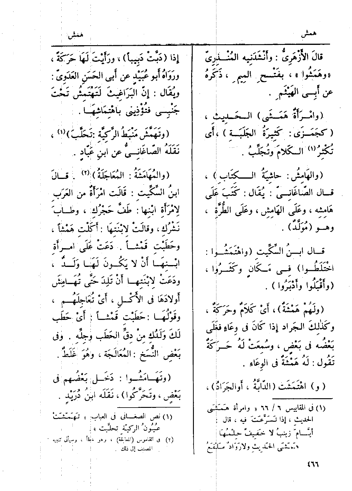 قالَ الأَزْهَرِيُّ: وأَنْشَدَنِيه المُنْذِرِيّ وهَمَشُوا، بفَتْحِ المِيمِ، ذَكَرهُ عَن أَبِي الهَيْثَمِ. وامْرَأَةٌ هَمَشَي الحَدِيثِ، كجَمْزَي: كَثِيرَةُ الجَلَبَةِ، أَي تُكْثِرُ الكَلامَ وتُجَلِّبُ. والهَامِشُ: حاشِيَةُ الكِتَابِ، قَالَ الصّاغَانِيّ: يُقَال: كَتَبَ عَلَى هَامِشِه، وعَلَى الهَامِشِ، وعَلَى الطُّرَّةِ، وَهُوَ مُوَلَّدٌ. قَالَ ابنُ السِّكِّيتِ واهْتَمَشُوا: اخْتَلَطُوا فِي مَكَانٍ وكَثَرُوا، وأَقْبَلُوا وأَدْبَرُوا. ولَهُمْ هَمْشَةٌ، أَيْ كَلاَمٌ وحَرَكَةٌ، وكَذلِكَ الجَراد إِذا كَانَ فِي وِعَاءٍ فغَلَى بَعْضُه فِي بَعْضٍ، وسُمِعَتْ لَهُ حَرَكَةٌ تَقُول: لَهُ هَمْشَةٌ فِي الوِعَاءِ. واهْتَمَشَت الدّابَّةُ، أَو الجَرَادُ، إِذا دَبَّتْ دَبِيباً، ورَأَيْتَ لَهَا حَرَكَةً، ورَوَاهُ أَبو عُبَيْدٍ عَن أَبِي الحَسَنِ العَدَوِيّ: ويُقَال: إِنّ البَرَاغِيثَ لَتَهْتْمِشُ تَحْتَ جَنْبِي فتُؤْذِيني باهْتِمَاشِهَا. وتَهَمَّشَ مَنْبَطُ الرَّكِيَّةِ: تَحَلَّبَ، نَقَلَهُ الصّاغَانِيُّ عَن ابنِ عَبّادٍ. والمُهَامَشَةُ: المُعَاجَلَةُ. قالَ ابنُ السِّكِّيتِ: قَالَت امْرَأَةٌ من العَرَبِ لامْرَأَةِ ابْنِها: طَفَّ حَجْرُكِ، وطابَ نَشْرُكِ، وقالَتْ لابْنَتِهَا: أَكَلْتِ هَمْشاً، وحَطَبْتِ قَمْشاً. دَعَتْ عَلَى امرأَةِ ابْنِهَا أَنْ لَا يَكُونَ لَهَا وَلَدٌ، ودَعَتْ لابْنَتِها أَنْ تَلِدَ حَتَّى تُهامِشَ أَولادَهَا فِي الأَكْلِ، أَيْ تُعَاجِلَهُم، وقَوْلُهَا: حَطَبْتِ قَمْشاً: أَيْ حَطَب لَكَ وَلَدُكِ مِنْ دِقِّ الحَطَب وجِلِّهِ. وَفِي بَعْضِ النُّسَخ: المُعَالَجَة، وهُوَ غَلَطٌ. وتَهَامَشُوا: دَخَل بَعْضُهم فِي بَعْضٍ، وتَحَرَّكُوا، نَقَلَه ابنُ دُرَيْدٍ.