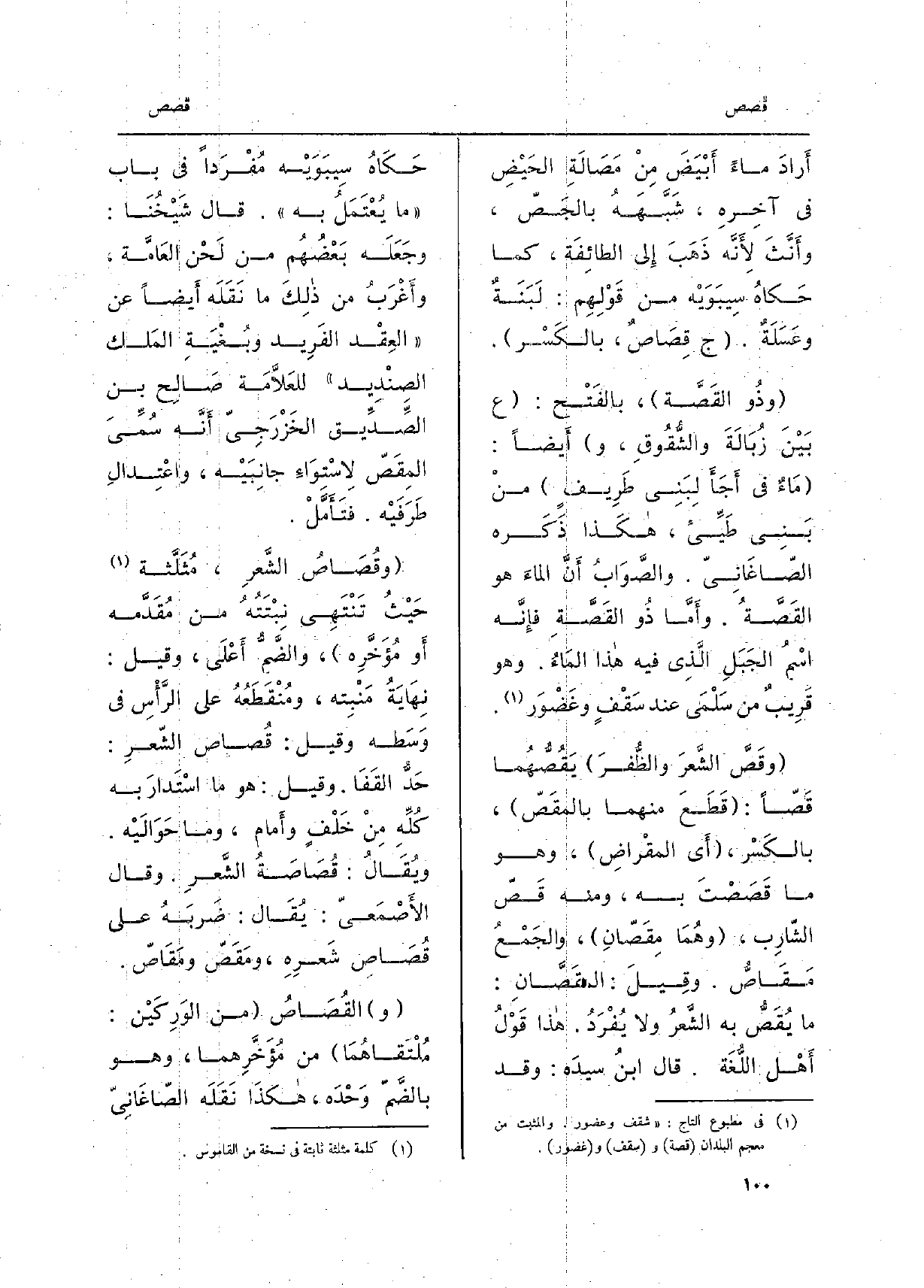أَرادَ مَاء أَبْيَضَ مِنْ مَصَالَةِ الحَيْضِ فِي آخِرِه، شَبَّهَهُ بالجَصّ، وأَنَّثَ لأَنَّه ذَهَبَ إِلى الطائِفَة، كَمَا حَكاهُ سِيبَوَيْه من قَوْلِهِم: لَبَنَةٌ وعَسَلَةٌ. ج {قِصَاصٌ، بالكَسْر. وذُو} القَصَّة، بالفَتْح: ع بَيْنَ زُبَالَةَ والشُّقُوقِ، وأَيضاً: مَاءٌ فِي أَجَأَ لِبَنِي طَرِيفٍ منْ بَنِي طَيِّئ، هكَذا ذَكَره الصّاغَانِيّ. والصَّوَابُ أَنَّ الماءَ هُوَ القَصَّةُ. وأَمَّا ذُو القَصَّةِ فإِنَّه اسْمُ الجَبَلِ الَّذِي فِيهِ هَذَا المَاءُ. وَهُوَ قَرِيبٌ من سَلْمَى عِنْد سَقْفٍ وغَضْوَر. {وقَصَّ الشَّعرَ والظُّفرَ} يَقُصُّهُما {قَصّاً: قَطَعَ مِنْهُمَا بالمقَصّ، بالكَسْر، أَي المِقْراضِ، وَهُوَ مَا} قَصَصْتَ بِهِ، وَمِنْه قَصّ الشَّارِب، وهُمَا {مِقَصّانِ، والجَمْعُ مَقَاصُّ. وقِيلَ:} المِقَصَّانِ: مَا يُقَصُّ بِه الشَّعرُ وَلَا يُفْرَدُ. هَذَا قَوْلُ أَهْل اللُّغَة. قَالَ ابنُ سيدَه: وَقد حَكَاهُ سِيبَوَيْه مُفْرَداً فِي بَاب مَا يُعْتَمَلُ بِهِ. قَالَ شَيْخُنَا: وجَعَلَه بَعْضُهُم من لَحْنِ العَامَّة، وأَغْرَبُ من ذلِكَ مَا نَقَلَه أَيضاً عَن العِقْد الفَرِيد وبُغْيَةِ المَلك الصِنْدِيد للعَلاَّمَة صَالِح بن الصِّدِّيق الخَزْرَجِيّ أَنَّه) سُمِّيَ {المِقَصّ لاسْتِوَاءِ جانِبَيْه، واعْتِدَالِ طَرَفَيْه. فتَأَمَّلْ. وقُصَاصُ الشَّعر، مُثَلَّثة حَيْثُ تَنْتَهِي نِبْتَتُهُ من مُقَدَّمه أَو مُؤَخَّرِه، والضَّمُّ أَعْلَى، وَقيل: نِهَايَةُ مَنْبِتِه، ومُنْقَطَعُهُ على الرَّأْسِ فِي وَسَطه وَقيل:} قُصاص الشّعرِ: حَدُّ القَفَا. وَقيل: هُوَ مَا اسْتَدَارَ بِهِ كُلِّهِ مِنْ خَلْفٍ وأَمام، وَمَا حَوَالَيْه.