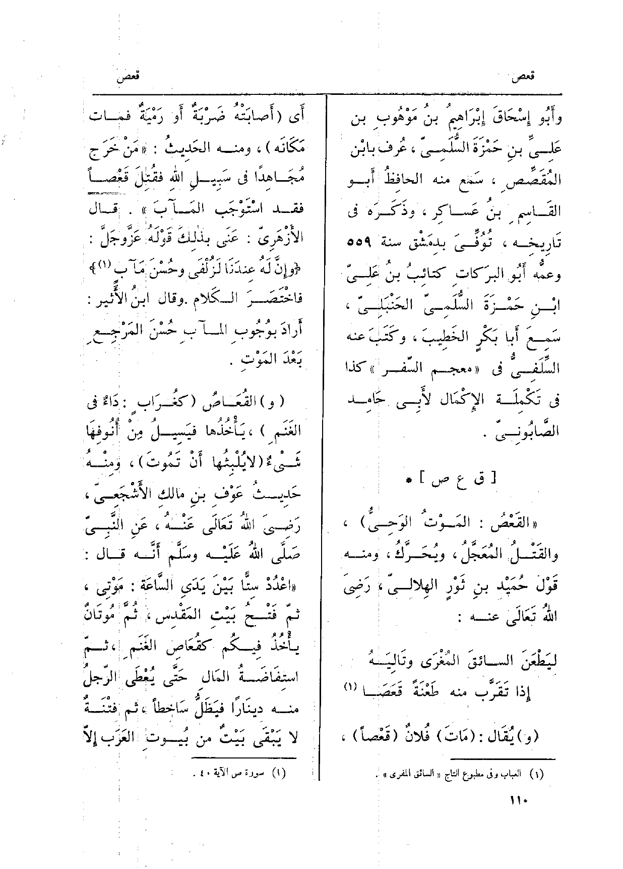 يُقَال: مَاتَ فُلانٌ قَعْصاً، أَي أَصابَتْهُ ضَرْبَةٌ أَو رَمْيَةٌ فَمَاتَ مَكَانَه، وَمِنْه الحَدِيثُ: مَنْ خَرَج مُجَاهِداً فِي سَبِيلِ اللهِ فقُتِلَ قَعْصاً فقد اسْتَوْجَب المَآبَ. قَالَ الأَزْهَرِيّ: عَنَى بذلِكَ قَوْلَهُ عَزَّ وجَلَّ: وإِنَّ لَهُ عِندَنَا لَزُلْفَى وحُسْنَ مَآبٍ فاخْتَصَرَ الكَلام. وَقَالَ ابنُ الأَثير: أَرادَ بوُجُوبِ المآبِ حُسْنَ المَرْجِعِ بَعْدَ المَوْتِ. القُعَاصُ كغُرَابٍ: دَاءٌ فِي الغَنَمِ، يَأْخُذُها فيَسِيلُ مِنْ أُنُوفِهَا شَيْءٌ لَا يُلْبِثُها أَنْ تَمُوتَ، ومِنْهُ حَدِيثُ عَوْفِ بنِ مالكِ الأَشْجَعِيّ، رَضِيَ للهُ تَعَالَى عَنْهُ، عَنِ النَّبِيّ صَلَّى اللهُ عَلَيْه وسَلَّم أَنَّه قَالَ: اعْدُدْ سِتّاً بَيْنَ يَدَيِ السَّاعَة: مَوْتِي، ثمّ فَتْحُ بَيْتِ المَقْدِس، ثُمَّ مُوتَانٌ يأْخُذُ فِيكُن كقُعَاصِ الغَنَمِ، ثمّ استِفَاضَةُ المَالِ حَتَّى يُعْطَى الرّجلُ مِنْهُ دينَاراً فيَظَلُّ سَاخطاً، ثمَّ فتْنَةٌ لَا يَبْقَى بَيْتٌ من بُيوتِ العَرَب إِلاّ