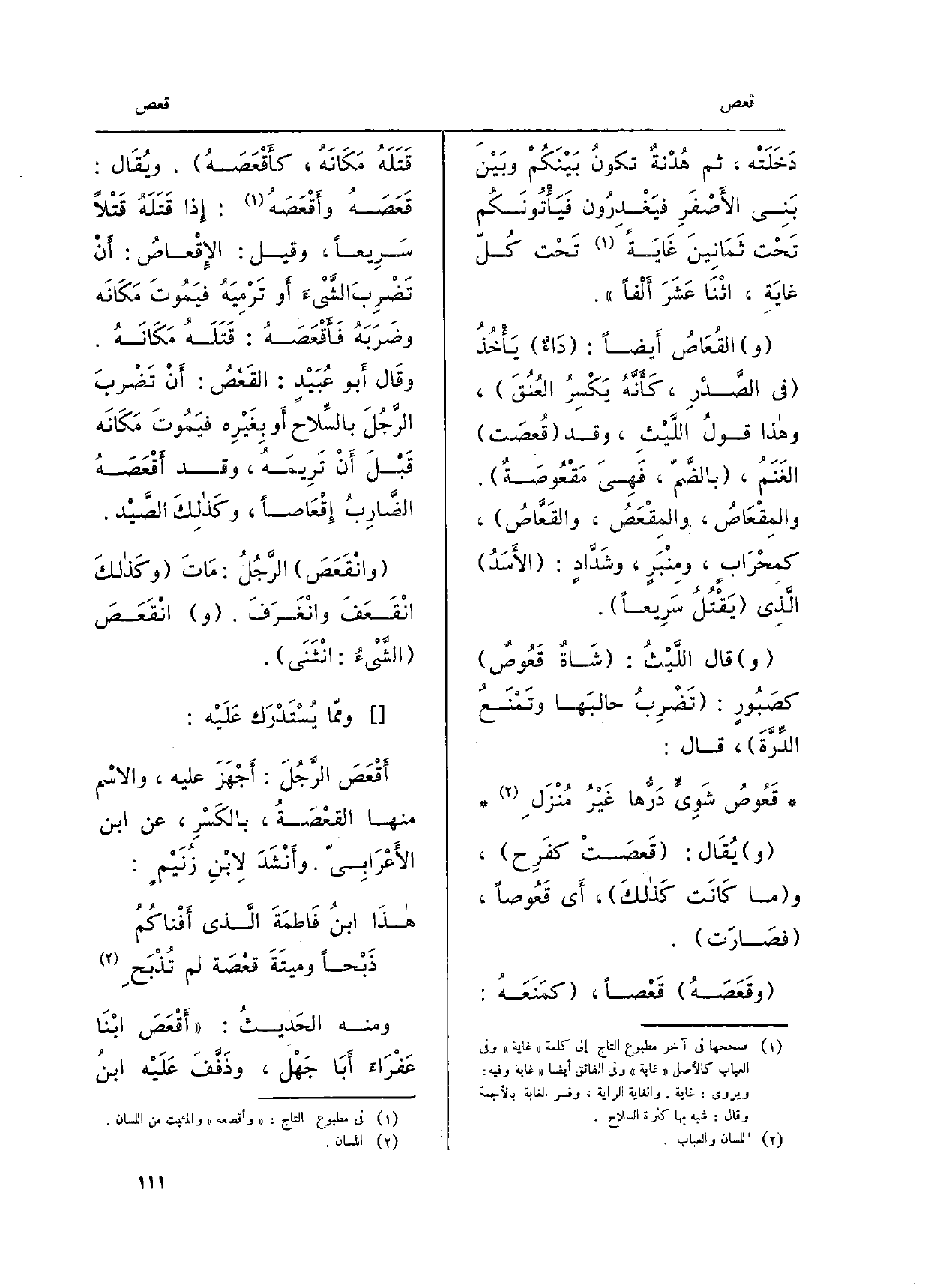 دَخَلَتْه، ثمَّ هُدْنةٌ تكونُ بَيْنَكُمْ وبَيْنَ بَنِي الأَصْفَرِ فَيَغْدِرُون فَيَأْتُونَكُم تَحْت ثَمَانِينَ غَايَةً تَحْت كُلّ غايَةِ، اثْنَا عَشَرَ أَلْفاً. القُعَاصُ أَيضاً: دَاءٌ يَأْخُذُ فِي الصَّدْرِ، كأَنَّهُ يَكْسِرُ العُنُقَ، وَهَذَا قولُ اللَّيْثِ، وَقد قُعِصَت الغَنَمُ، بالضَّمّ، فَهِيَ مَقْعُوصَةٌ. والمِقْعَاصُ، والمِقْعَصُ، والقَعَّاصُ، كمِحْرَابٍ، ومِنْبَرٍ، وشَدَّادٍ: الأَسَدُ الَّذِي يَقْتُلُ سَرِيعاً. قَالَ اللَّيْثُ: شاةٌ) قَعُوصٌ كصَبُورٍ: تَضْرِبُ حالبَها وتَمْنَعُ الدِّرَّةَ، قَالَ: قَعُوصُ شَوِيٍّ دَرُّها غَيْرُ مَنْزَلِ يُقَال: قَعَصَتْ كفَرِح، وَمَا كَانَت كَذلكَ، أَي قَعُوصاً، فصَارَت. وقَعَصَهُ قَعْصاً، كَمَنَعَهُ: قَتَلَهُ مَكَانَهُ، كأَقْعَصَهُ. ويُقَال: سَرِيعاً، وَقيل: الإِقْعاصُ: أَنْ تَضْرِبَ الشَّيْءَ أَو تَرْمِيَهُ فيَمُوتَ مَكَانَه وضَرَبَهُ فَأَقْعَصَهُ: قَتَلَهُ مَكَانَهُ. وقَال أَبو عُبَيْدٍ: القَعْصُ: أَنْ تَضْربَ الرَّجُلَ بالسِّلاح أَو بِغَيْرِه فيَمُوتَ مَكَانَه قَبْلَ أَنْ تَرِيمَهُ، وَقد أَقْعَصَهُ الضَّارِبُ إِقْعَاصاً، وكَذلِكَ الصَّيْد. وانْقَعَصَ الرَّجُلُ: مَاتَ وكَذلكَ انْقَعَفَ وانْغَرَفَ. انْقَعَصَ الشَّيْءُ: انْثَنَى. وممّا يُسْتَدْرَك عَلَيْه: أَقْعَصَ الرَّجُلَ: أَجْهَزَ عَلَيْهِ، والاسْم مِنْهَا القْعْصَةُ، بالكَسْرِ، عَن ابْن الأَعْرَابِيّ. وأَنْشَدَ لابْنِ زُنَيْمٍ: