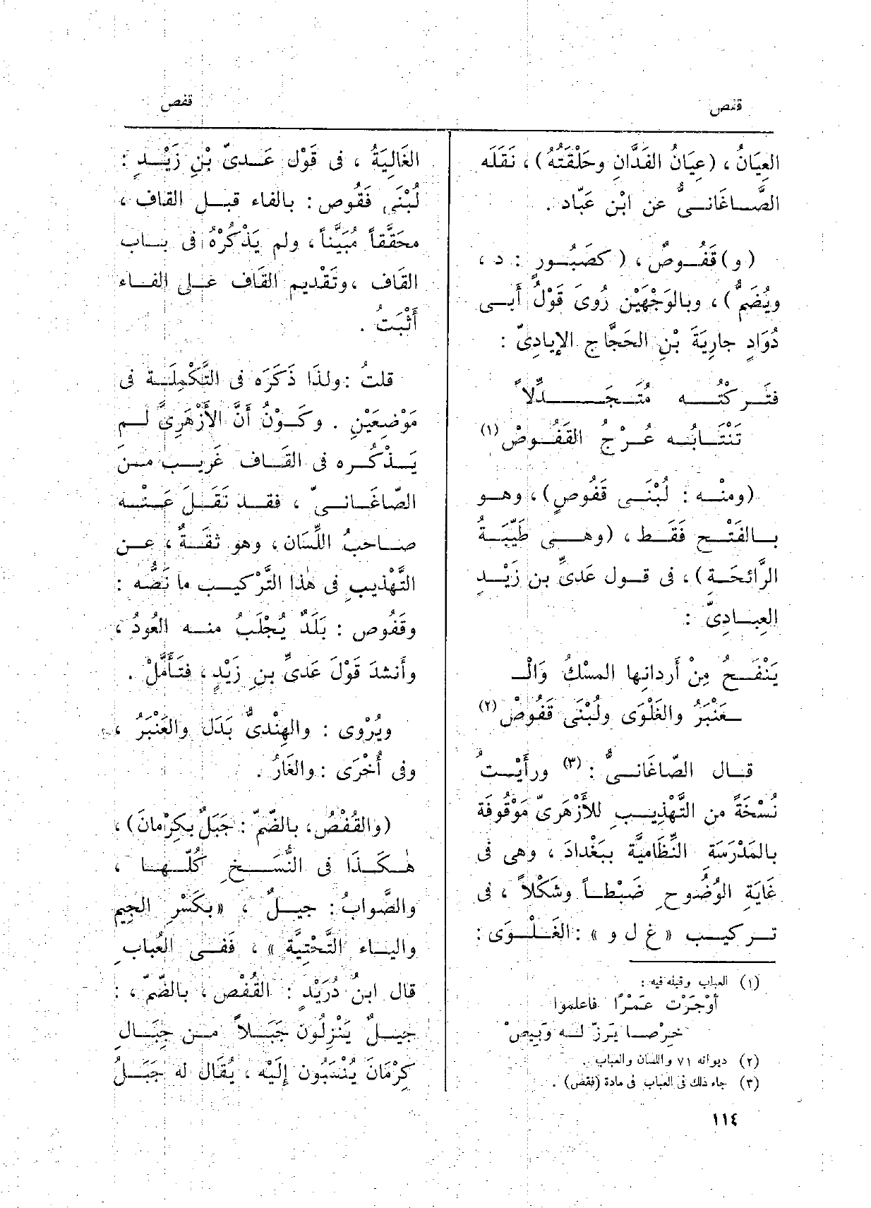 قَالَ الصّاغَانيُّ: ورأَيْتُ نُسْخَةً من التَّهْذِيبِ للأَزْهَريّ مَوْقُوفَة بالمَدْرَسَةِ النِّظَاميَّة ببَغْدادَ، وَهِي فِي غَايَةِ الوُضُوحِ ضَبْطاً وشَكْلاً، فِي تركيب غ ل و: الغَلْوَى: الغَالِيَةُ، فِي قَوْل عَديّ بْنِ زَيْدٍ: لُبْنَة فَقُوص: بِالْفَاءِ قبل الْقَاف، محَقَّقاً مُبَيَّناً، وَلم يَذْكُرْهُ فِي بَاب القَاف، وتَقْدِيم القَاف على الْفَاء أَثْبَتُ. قلتُ: ولذَا ذَكَرَه فِي التَّكْمِلَة فِي مَوْضِعَيْنِ. وكَوْنُ أَنَّ الأَزْهَرِيَّ لم يَذْكُره فِي القَاف غَريب منَ الصّاغَانيّ، فقد نَقَلَ عَنْه صاحبُ اللِّسَان، وَهُوَ ثقَةٌ، عَن التَّهْذِيبِ فِي هَذَا التَّرْكِيب مَا نَصُّه: وقَفُوص: بَلَدٌ يُجْلَبُ مِنْهُ العُودُ، وأَنْشدَ قَوْلَ عَديِّ بنِ زَيْدٍ، فتَأَمَّلْ. ويُرْوَى: والهِنْديُّ بَدَل والعَنْبَرُ، وَفِي أُخْرَة: والغَارُ. والقُفْصُ، بالضّمّ: جَبَلٌ بكِرْمانَ، هكَذَا فِي النُّسَخِ كُلّها، والصَّوابُ: جِيلٌ، بكَسْرِ الجِيم وَالْيَاء التَّحْتِيَّة، فَفي العُبابِ قَالَ ابنُ دُرَيْدٍ: القُفْص، بالضّمّ،: جيلٌ يَنْزِلُون جَبَلاً من جِبَالِ كِرْمَانَ يُنْسَبُون إِلَيْه، يُقَال لَهُ جَبَلُ