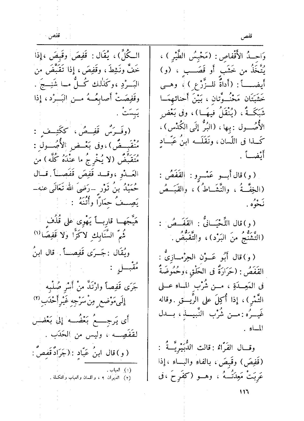 وَاحِدُ الأَقْقاصِ: مَحْبِسُ الطَّيْرِ، يُتَّخَذُ من خَشَب أَو قَصَبٍ، أَيضاً: أَداةٌ للزَّرْعِ، وَهِي خَشَبَتَان مَحْنُوَّتانِ، بَيْنَ أَحنائهمَا شَبَكَةٌ، يُنْقَلُ فيهَا، وَفِي بَعْضِ الأُصُول: بِها، البُرُّ إِلَى الكُدْس، كَذا فِي اللّسان، ونَقَلَه ابنُ عَبّادٍ أَيضاً. قَالَ أَبو عَمْرِو: القَفَصُ: الخِفَّةُ، والنَّشَاطُ، والقَبَصُ نَحْوُه. قَالَ اللِّحْيَانيُّ: القَفَصُ: التَّشَنُّجُ منَ البَرْد، والتَّقَبُّضُ. قَالَ أَبُو عَوْن الحِرْمازِيُّ: القَفَصُ: حَرَارَةٌ فِي الحَلْقِ، وحُمُوضَةٌ فِي المَعِدَةِ، من شُرْبِ الماءِ على التَّمْرِ، إِذا أُكِلَ على الرِّيقِ. وَقَالَهُ غَيْرُه:)