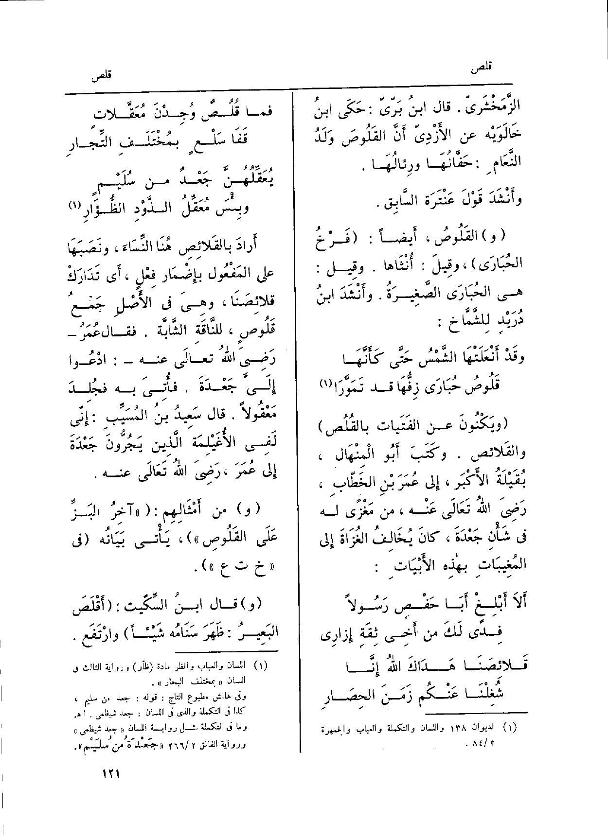 الزَّمَخْشَريّ. قَالَ ابنُ) بَرّيّ: حَكَى ابنُ خَالَوَيْه عَن الأَزْدِيّ أَنَّ القَلُوصَ وَلَدُ النَّعَامِ: حَفَّانُهَا ورِئالُهَا. وأَنْشَدَ قَوْلَ عَنْتَرَة السَّابِق. القَلُوصُ، أَيضاً: فَرْخُ الحُبَارَى، وقِيلَ: أُنْثَاها. وقِيل: هِيَ الحُبَارَى الصَّغِيرَةُ. وأَنْشَدَ ابنُ دُرَيْدٍ لِلشَّمَّاخ: