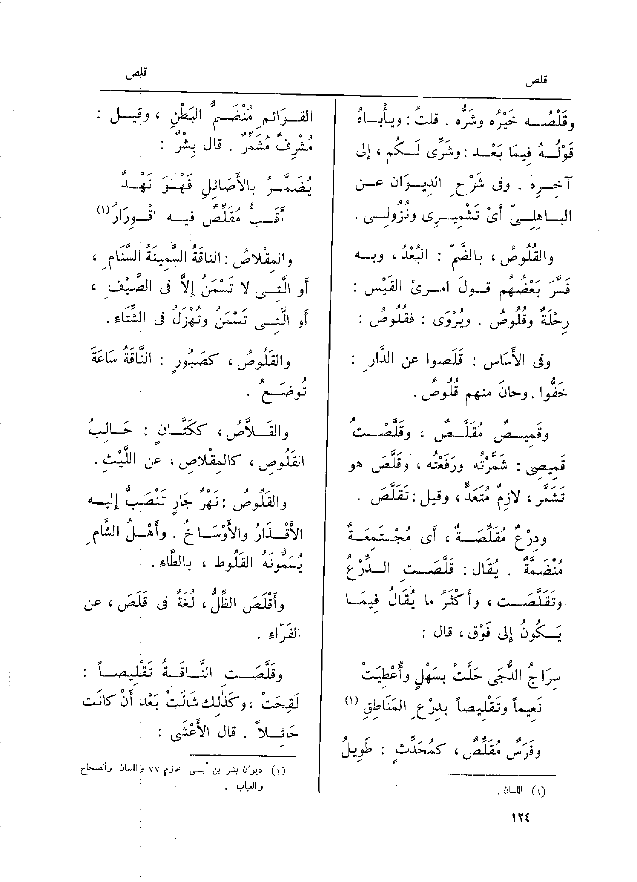 ويُرْوَى: فقُلُوصُ: وَفِي الأَسَاس: قَلَصوا عَن الدَّارِ: خَفُّوا. وحانَ مِنْهُم قُلُوصٌ. وقَمِيصٌ مُقَلَّصٌ، وقَلَّصْتُ قَمِيصِي: شَمَّرْتُه ورَفَعْتُه، وقَلَّصَ هُوَ تَشَمَّر، لازِمٌ مُتَعَدٍّ، وَقيل: تَقَلَّصَ. ودِرْعٌ مُقَلِّصَةٌ، أَي مُجْتَمِعَةٌ مُنْظَمَّةٌ. يُقَال: قَلَّصَتِ الدِّرْعُ وتَقَلَّصَت، وأَكْثَرُ مَا يُقَالُ فِيمَا يَكُونُ إِلى فَوْق، قَالَ:)
