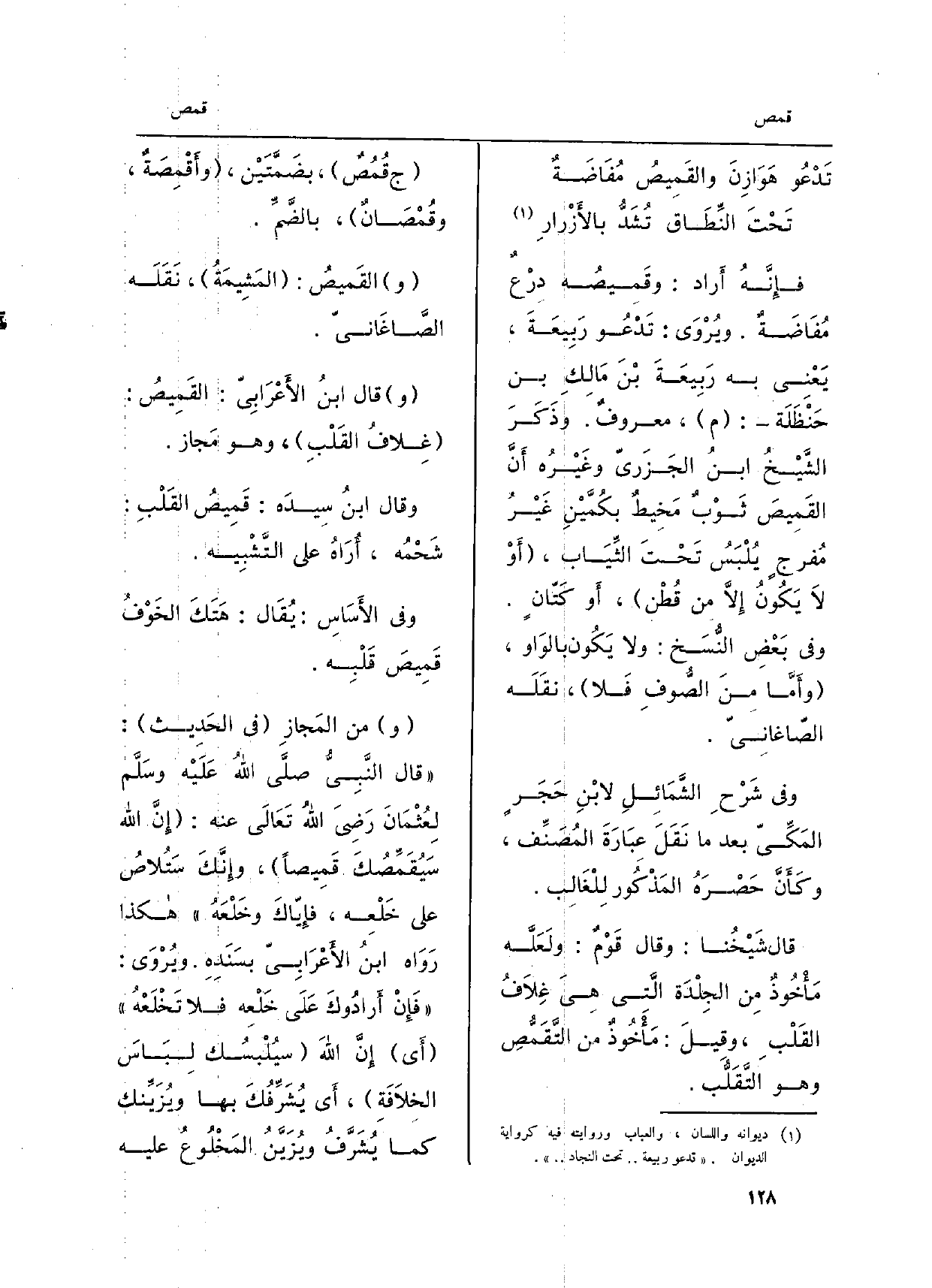 فإِنَّهُ أَراد: وقَميصُه درْعٌ مُفَاضَةٌ. ويُرْوَى: تَدْعُو رَبِيعَةَ، يَعْنِي لَهُ رَبِيَعَةَ بْنَ مَالكِ بن حَنْظَلَه: م، معروفٌ. وذَكَرَ الشَّيْخُ ابنُ الجَزَريّ وغَيْرُه أَنَّ القَمِيصَ ثَوْبٌ مَخيطٌ بكُمَّيْنِ غَيْرُ مُفرجٍ يُلْبَسُ تَحْتَ الثِّيَاب، أَوْ لاَ يَكُونُ إِلاَّ من قُطْن، أَو كَتّانٍ. وَفِي بَعْض النُّسَخ: وَلَا يَكُون بالوَاو، وأَمَّا منَ الصُّوفَ فَلا، نقَلَه الصّاغَانيّ. وَفِي شَرْحِ الشَّمَائِلِ لابْنِ حَجَرٍ المَكِّيّ بعد مَا نَقَلَ عبَارَةَ المُصَنِّف، وكَأَنَّ حَصْرَهُ المَذْكُورِ لِلْغَالب. قَالَ شَيْخُنا: وَقَالَ قَوْمٌ: ولَعَلَّه مَأْخُوذٌ من الجِلْدَة الَّتي هيَ غِلاَفُ القَلْبِ، وقِيلَ: مَأْخُوذٌ من التَّقَمُّصِ وَهُوَ التَّقَلُّب. ج قُمُصٌ، بضَمَّتَيْن، وأَقْمِصَةٌ، وقُمْصَانٌ، بالضَّمِّ. القَمِيصُ: المَشِيمَةُ، نَقَلَه الصَّاغَانيّ. قَالَ ابنُ الأَعْرَابِيّ: القَميصُ: غلافُ القَلْبِ، وَهُوَ مَجاز. وَقَالَ ابنُ سِيدَه: قَميصُ القَلْبِ: شَحْمُه، أُرَاهُ على التَّشْبِيه.